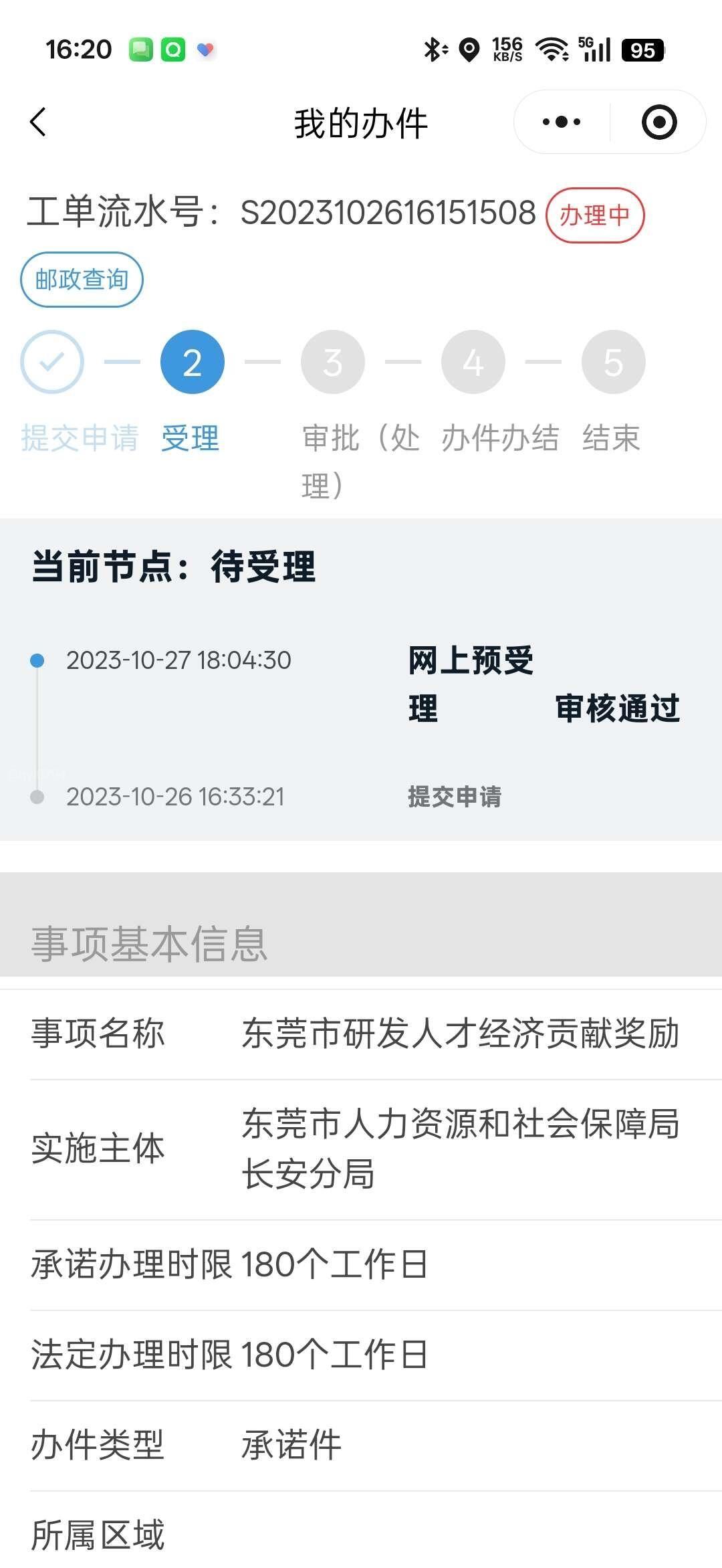 在2023年10月27日提交的2022年东莞市研发人才经济贡献奖励资料,承诺办理时限180个工作日,现在已经2026年了,过去了2年半时间毫无进展,也没有给出明确的反馈意见,请相关部门帮忙确认一下。 作为对比,在2023年3月4日提交的2021年东莞市研发人才经济贡献奖,在2023年7月13日就完成了办结,也已经收到了相关的款项。