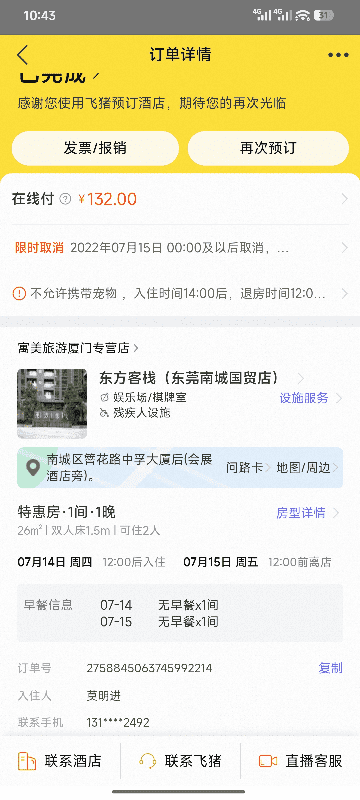 东方客栈(东莞南城店)不开发票