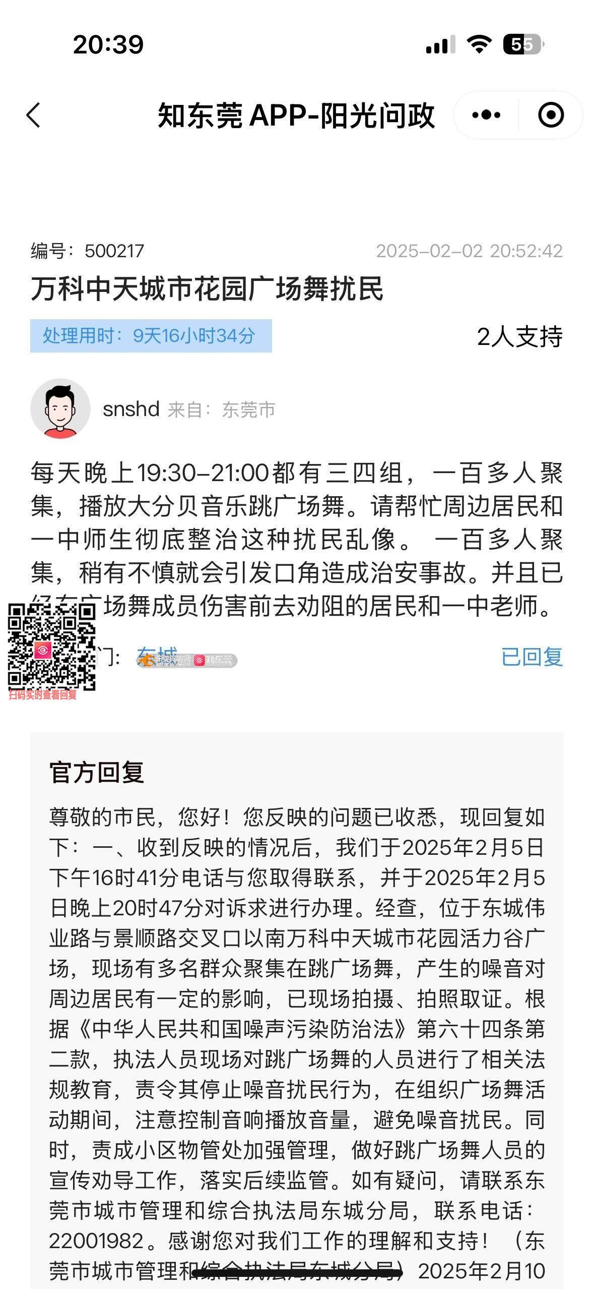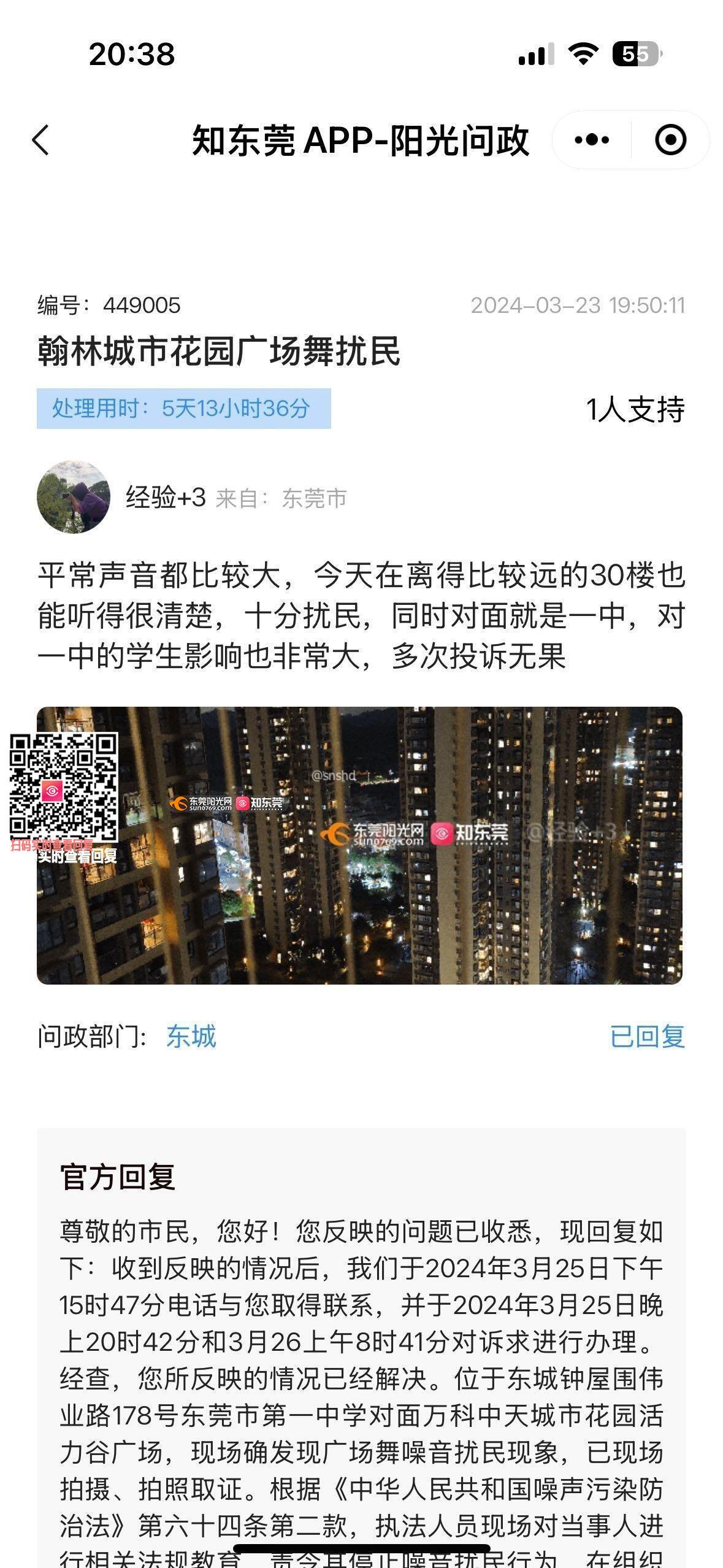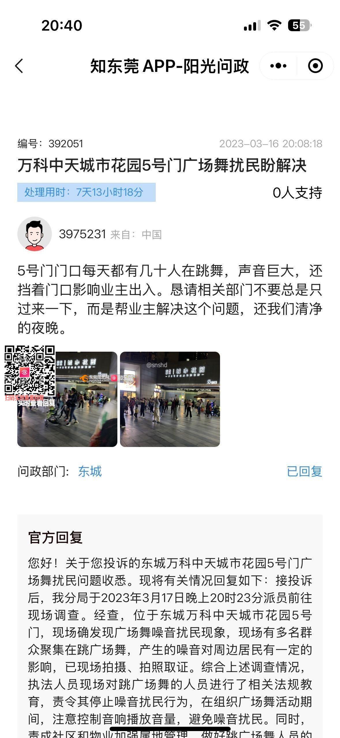 尊敬的市民,您好!您反映的问题已收悉,现回复如下:收到反映的情况后,我分局于2026年3月9日20时30分派员到现场,于2026年3月10日17时10分致电您进行回访说明相关情况。现回复如下: 我分局曾于2026年3月3日20时30分、3月4日20时40分、3月6日20时35分根据群众投诉进行现场调查,经多次在东城伟业路万科中天城市花园巡查现场暂未发现有广场舞噪音扰民现象,已现场拍摄、拍照取证。 再接投诉后,我分局于2026年3月9日20时30分再次派员到现场调查,现场有多名群众聚集在跳广场舞,已现场拍摄、拍照取证。根据《中华人民共和国噪声污染防治法》第六十四条第二款,执法人员现场对跳广场舞的人员进行了相关法规教育,责令其停止噪音扰民行为,在组织广场舞活动期间,注意控制音响播放音量,避免噪音扰民。同时,责成小区物管处加强巡查管理,做好跳广场舞人员的宣传劝导工作,落实后续监管。 前期,针对该处广场舞噪音扰民问题,我分局曾多次现场向广场舞人员派发《乱排放社会生活噪音类告知书》,并通过现场设置告示牌和噪音分贝显示仪等措施进行管控。也曾联合东泰社区、万科物管处和广场舞代表协调处理,建议在该处附近300米左右新选一个地方提供给广场舞人员使用,但广场舞人员仍然坚持要在原地方继续跳舞。综上,对该处广场舞噪音,我分局已落实了相应的措施,并积极协调和多次派员劝阻。如有疑问,请联系东莞市城市管理和综合执法局东城分局,联系电话:22001982。感谢您对我们工作的理解和支持!(东莞市城市管理和综合执法局东城分局)2026年3月12日