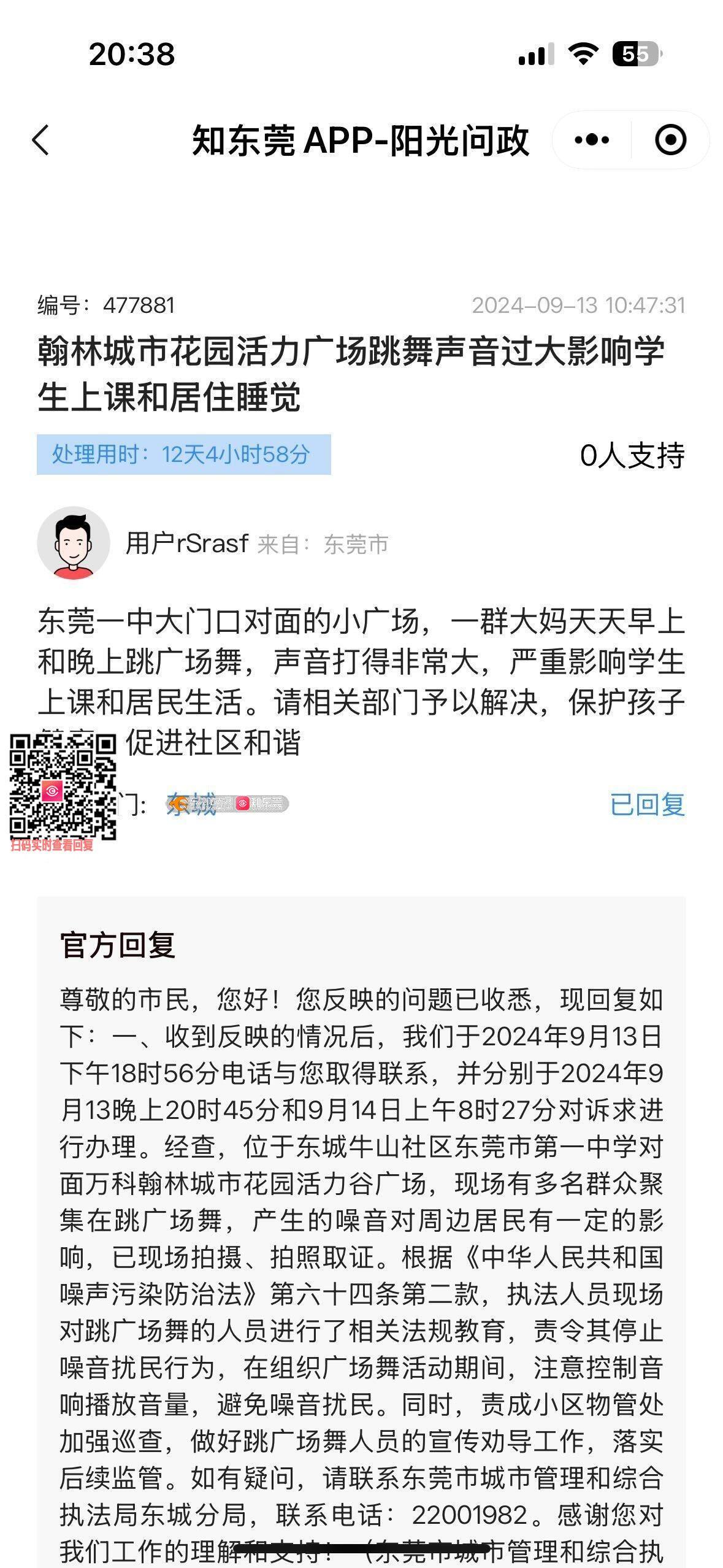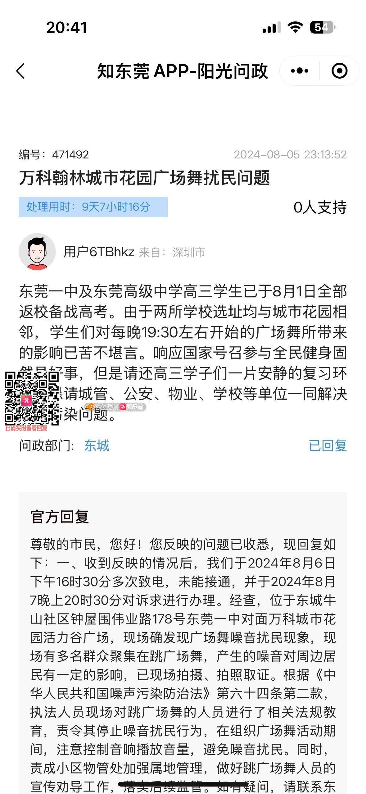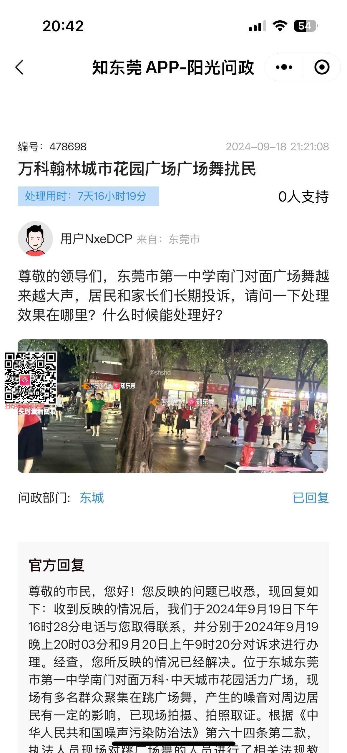 尊敬的市民,您好!您反映的问题已收悉,现回复如下:收到反映的情况后,我分局于2026年3月9日20时30分派员到现场,于2026年3月10日17时10分致电您进行回访说明相关情况。现回复如下: 我分局曾于2026年3月3日20时30分、3月4日20时40分、3月6日20时35分根据群众投诉进行现场调查,经多次在东城伟业路万科中天城市花园巡查现场暂未发现有广场舞噪音扰民现象,已现场拍摄、拍照取证。 再接投诉后,我分局于2026年3月9日20时30分再次派员到现场调查,现场有多名群众聚集在跳广场舞,已现场拍摄、拍照取证。根据《中华人民共和国噪声污染防治法》第六十四条第二款,执法人员现场对跳广场舞的人员进行了相关法规教育,责令其停止噪音扰民行为,在组织广场舞活动期间,注意控制音响播放音量,避免噪音扰民。同时,责成小区物管处加强巡查管理,做好跳广场舞人员的宣传劝导工作,落实后续监管。 前期,针对该处广场舞噪音扰民问题,我分局曾多次现场向广场舞人员派发《乱排放社会生活噪音类告知书》,并通过现场设置告示牌和噪音分贝显示仪等措施进行管控。也曾联合东泰社区、万科物管处和广场舞代表协调处理,建议在该处附近300米左右新选一个地方提供给广场舞人员使用,但广场舞人员仍然坚持要在原地方继续跳舞。综上,对该处广场舞噪音,我分局已落实了相应的措施,并积极协调和多次派员劝阻。如有疑问,请联系东莞市城市管理和综合执法局东城分局,联系电话:22001982。感谢您对我们工作的理解和支持!(东莞市城市管理和综合执法局东城分局)2026年3月12日
