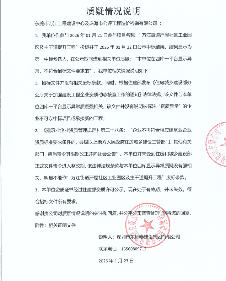 1、招标人发布《变更中标候选人的情况说明》不符合相关法律法规,里面内容完全没有根据。 2、 住建部办公厅《关于加强建设工程企业资质动态核查工作的通知》(建办市〔2024〕52号)第三条规定:对资质动态核查不合格的企业,将标注“资质异常”;招标人应审慎选择此类企业承揽工程。将“资质异常”作为否决性条件:“如在招标文件中明确要求投标人资质状态必须为“正常”,否则视为不符合资格条件。”招标文件并没有相关条款,该文件并没有条款说明被标注“资质异常”的企业不可以中标项目或承接新的工程;所以我单位可以正常中标承接工程。《建筑业企业资质管理规定》、住房城乡建设部第22号令等文件并没有提及标注“资质异常”的单位不能承揽新的工程。 3、根据本公司检索全国招标投标各个公共交易平台以及广东、东莞中标人情况,资质显示异常,但并不影响相关企业中标承接工程。 4、以上这些情况,本单位都有提供质疑说明和相关证明材料给到招标人,并未得到东莞市万江工程建设中心的相关书面回复,全国(包括东莞)多个标的同等情况都中标了,只有这个项目废标,是这个项目废标错了,还是全国的中标都错了?请回复整体问题?因对我司的不公平,已造成我司合计3652名本单位员工与相关供应链合作单位员工疑问,对单位公信力质疑,人心焕散,请给合理的说法,来安住员工的心。5、招标人(张*伟)无视我方于交易中心系统与现场相关证明材料,无理我司2026年2月14日9点23分的投诉,未有书面答复情况下与招标代理(刘工、梁工)与河南美盛宸建设工程有限公司互相勾结围标串标,并于2026年2月14日23点5