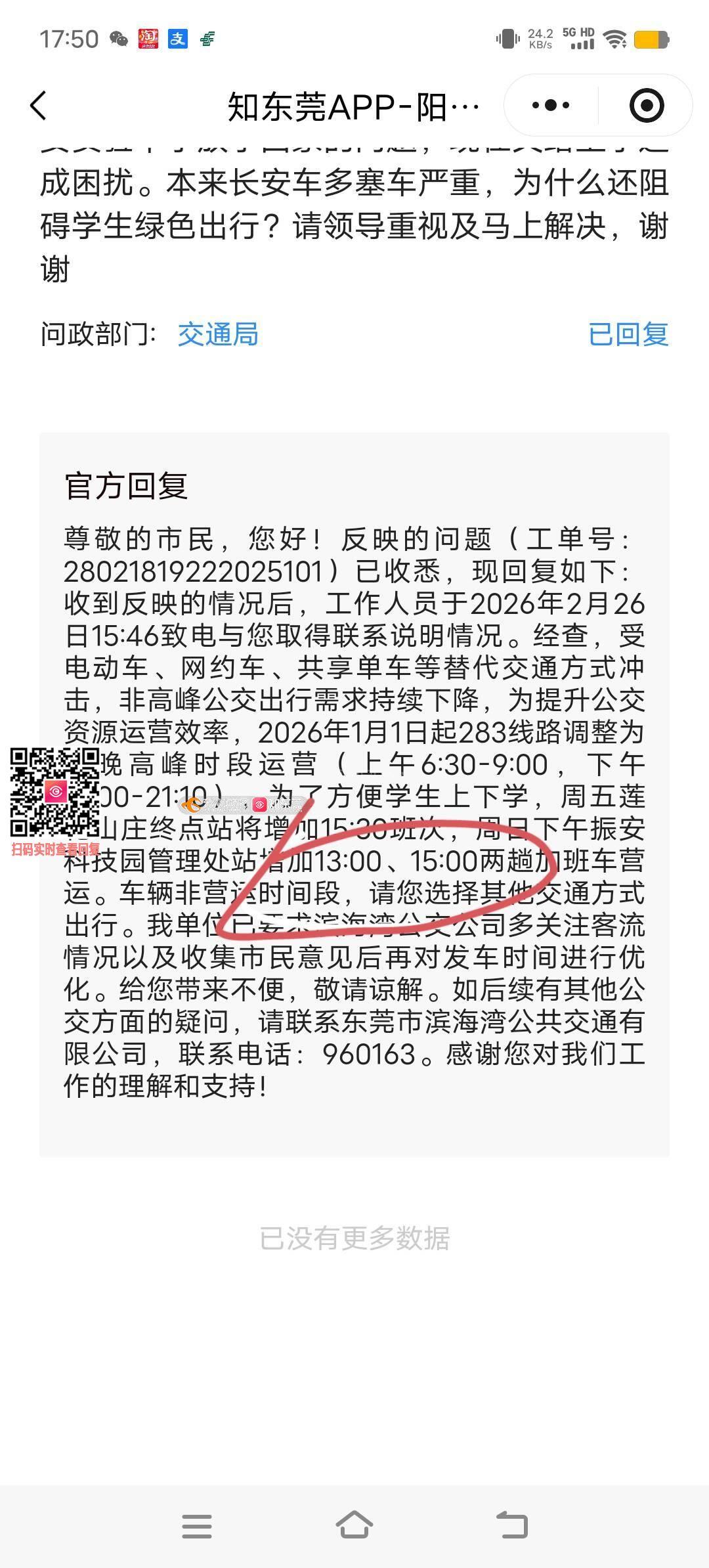 尊敬的领导: 前段时间我反应了长安实验学校学习上学不便的事,也得到了领导的积极回应和处理同意每周日增加下午1点和3点从振安科技园出发的班车,可是本周六却执行的是下午1点半才有车,请领导帮忙督促公交公司按照回复的时间执行或者增加更多车次,因为长安实验中学的学子实在太多,长安镇区堵车实在严重,所以多发展绿色出行,谢谢!