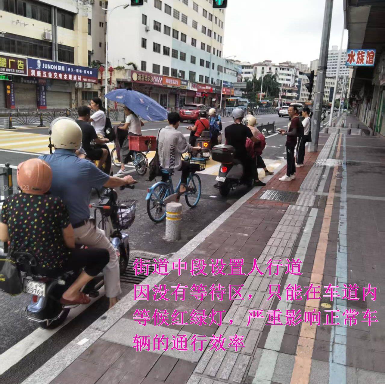 1、新设置的人行道位置和布置方式均不合理。 更新前路口布置的人行道,更新后多个路口人行道被取消。例如江滨交叉路口、金联交叉路口的人行道都被取消。根据《城市道路交通设施设计规范》原人行道的间距符合300m-500m的要求,没必要取消。根据《城市道路工程设计规范》人行横道交叉口必须设置。 新布置在江滨花园东侧的人行道远离路口而在街道中段,导致路口行人均要长距离绕行才能过马路。又不是繁华的商业街,在街道中段设置人行道是不符合规范的。 同样非机动车也要在街道中段绕行,因没有等待区,只能在车道内等候红绿灯,严重影响正常车辆的通行效率。 2、新设置的红绿灯不合理。 例如上面提到的人行道红绿灯。高峰期倒计时设置不合理。建设质量不过关,不到一年就敲开路面修了两次,花里胡哨,浪费公共资源。 3、公交站位置不合理。 例如江滨南侧站台往西侧迁移后离上一站华南摩尔才700米,且附近人行道取消后,北侧居民前往站台需要绕行很远。 根据《城市道路交通设施设计规范》过街设施距公交站及轨道站出入口不宜大于80m,最大不宜大于120m。实际大于150米。 原站台处如果位置不够设置,可以迁移北侧站台对面的空地前。