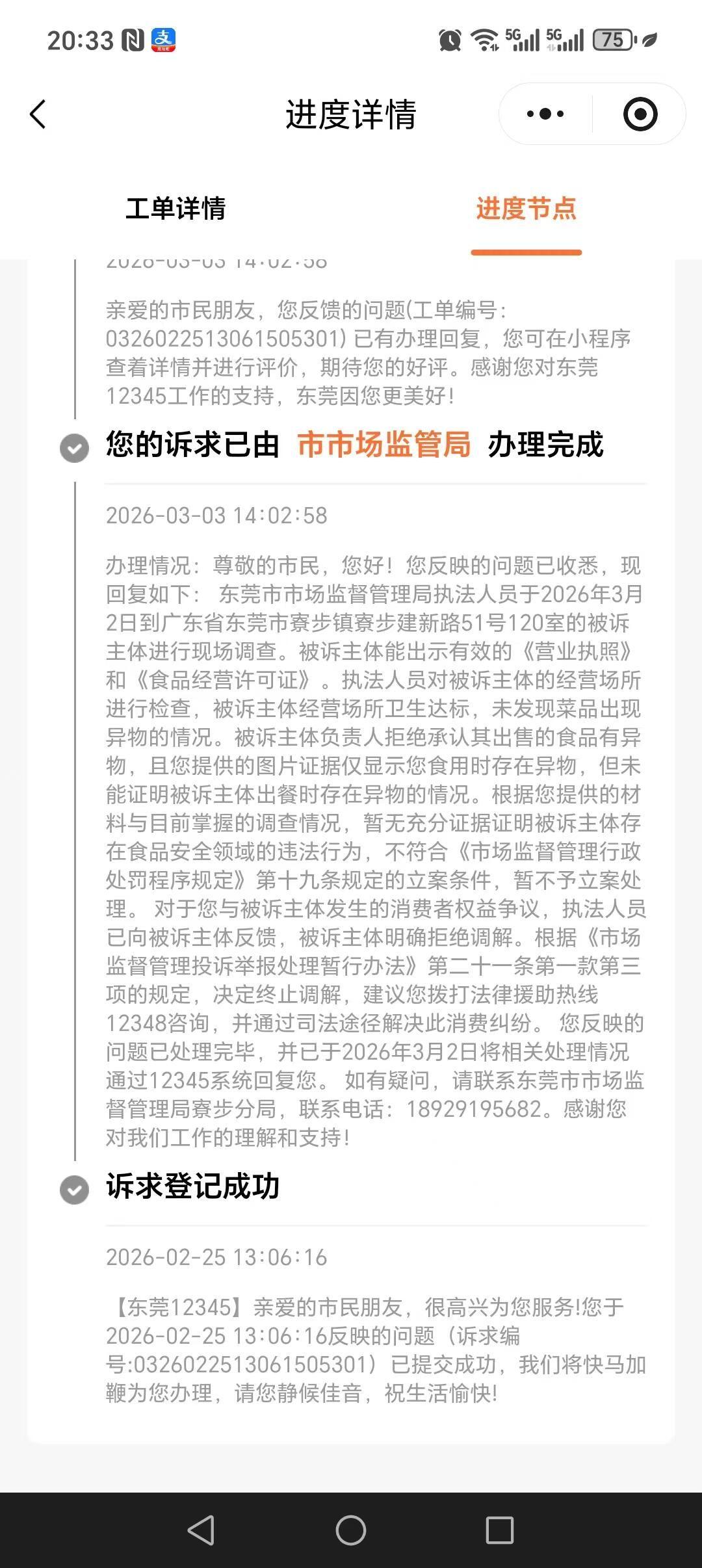 本人于2025年2月25日11点,在京东外卖平台点购一份小炒菜拆骨肉饭,用餐时在菜品中发现一枚黄鹤楼香烟烟头,当场感到极度恶心、反胃,心理受到严重影响,至今不敢再点外卖,一想起此事就痛苦不适。 事发后我已保留订单记录、餐品与异物照片等证据,并于中午向12345政务服务热线投诉维权。诉求编号:0326022513061505301.今日(3月3日)接到12345回复,因商家不认可,终止调查,建议走司法途径。 本人作为普通消费者,无力承担司法成本,仅希望政府部门履行监管职责,维护消费者合法权益:本人是在京东外卖平台购买的食品, 恳请相关部门督促京东外卖平台核实本次食品安全问题,依法依规重新调查处理。恳请相关部门督促京东外卖平台就此事向本人作出合理解释与诚恳道歉,并依法给予相应赔偿。 恳请相关部门督促平台加强对入驻商家的食品安全管理,杜绝类似问题再次发生,保障消费者用餐安全,恳请阳光问政平台予以关注并督办,谢谢!