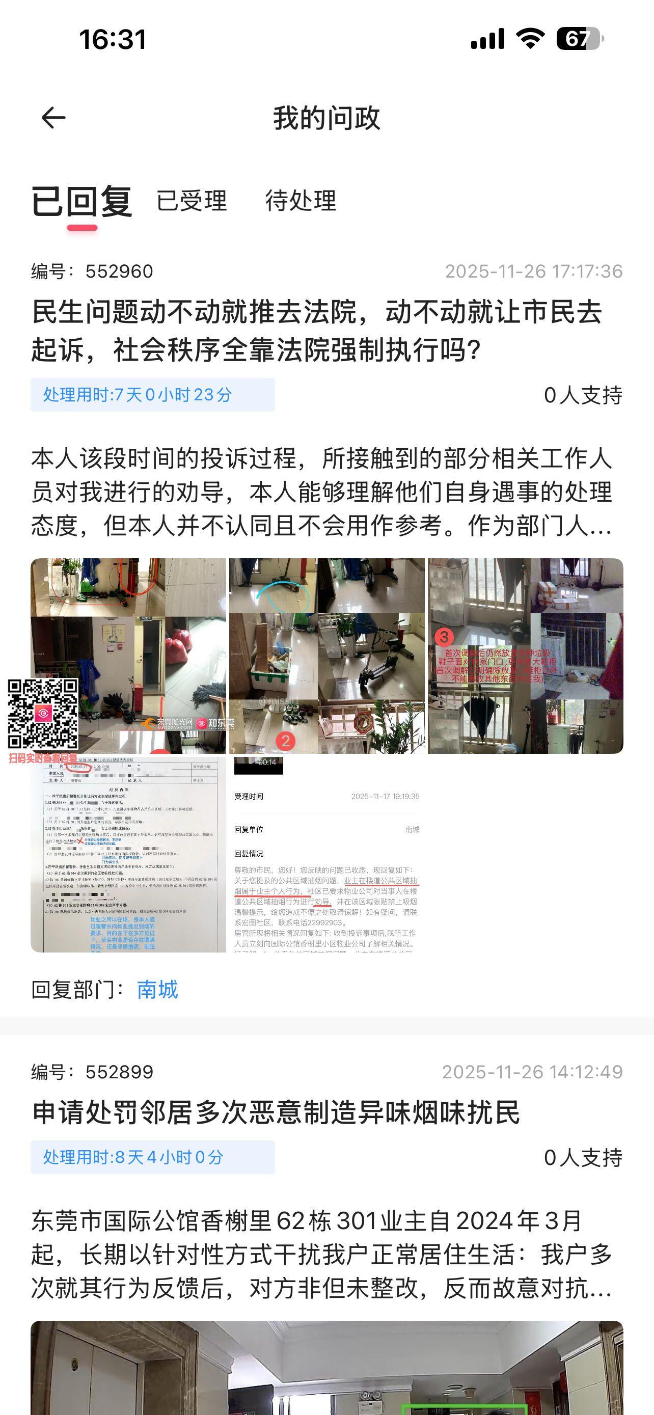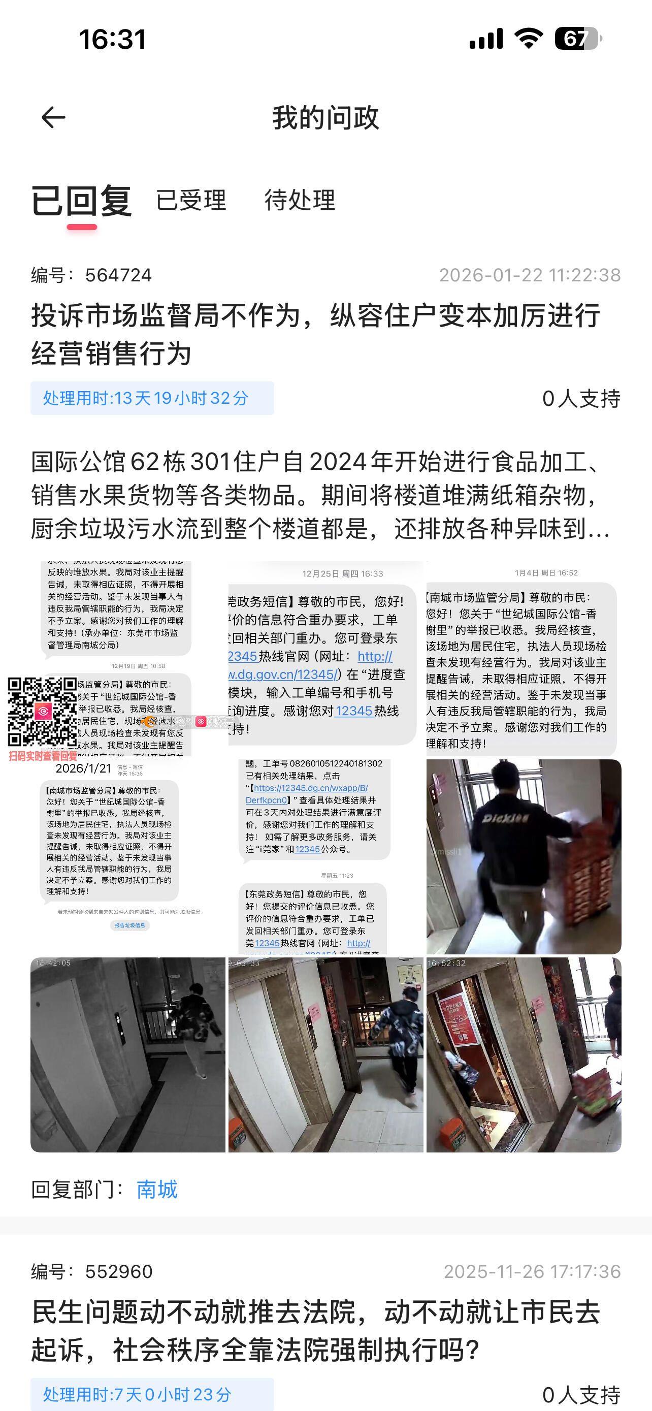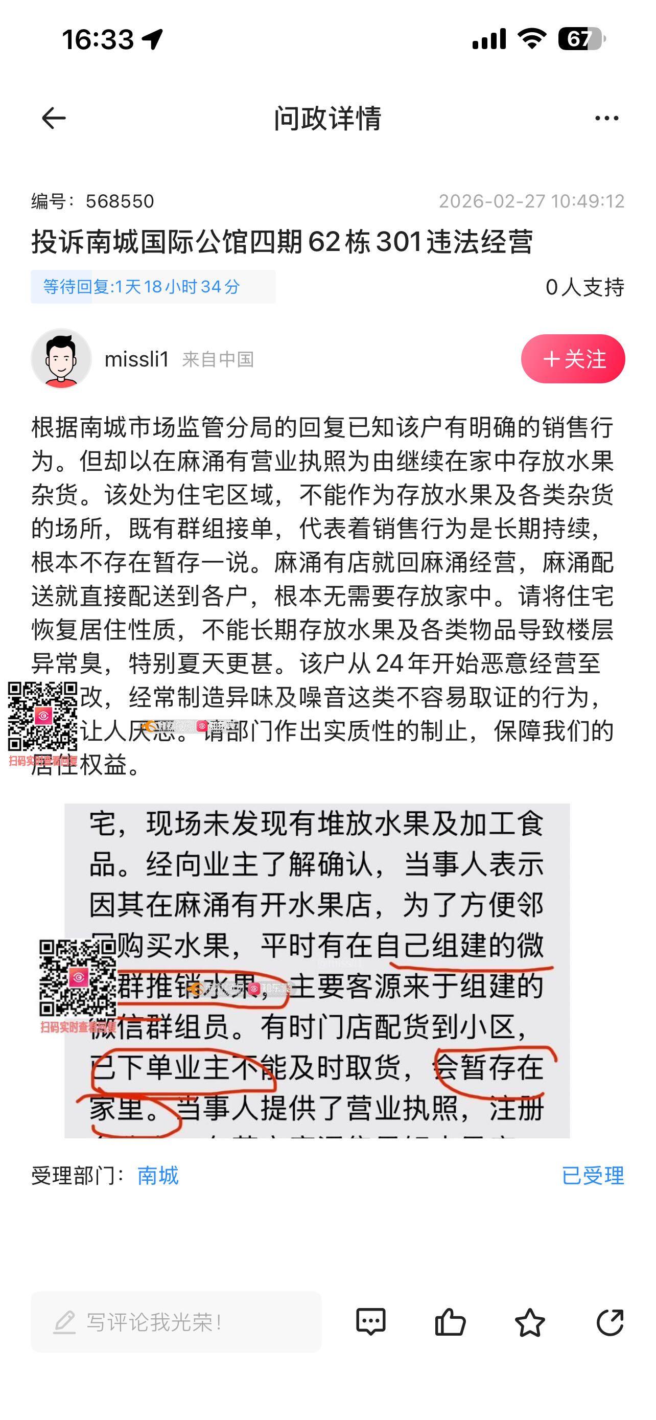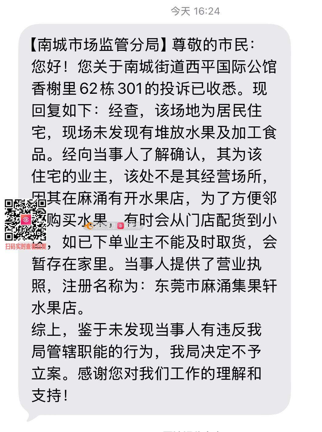 本人自2024年起,多次通过12345及问政平台投诉南城国际公馆四期62栋301业主在住宅内违法经营水果销售、堆放杂物的问题。然而,南城市场监管分局等部门的回复始终是“现场未发现经营行为”、“不予立案”的复制粘贴,对本人提供的视频、照片等证据视而不见,对本人反映的异味、噪音等问题避而不谈,严重损害了本人的合法居住权益。 事实非常清楚: 1. 301业主承认在小区微信群推销水果,客源来自小区业主,这是明确的、持续的经营行为,绝非“暂存”。 2. 其在住宅内长期存放用于销售的水果和杂货,改变了房屋性质,属于“住改商”。 3. 该行为已持续一年多,导致楼层异味、卫生脏乱、噪音扰民,对本人的生活造成影响。 相关部门的“不予立案”决定,完全是基于对事实的无视和漠视。这种“选择性执法”和“不作为”的行为,让普通市民感到被敷衍和戏弄。“现场没看到就等于没发生”这是典型的懒政和不作为。忽略“微信群推销”这一关键证据,将“住改商”的严重问题轻描淡写为“暂存”,这是对法律的曲解,也是对市民诉求的漠视。