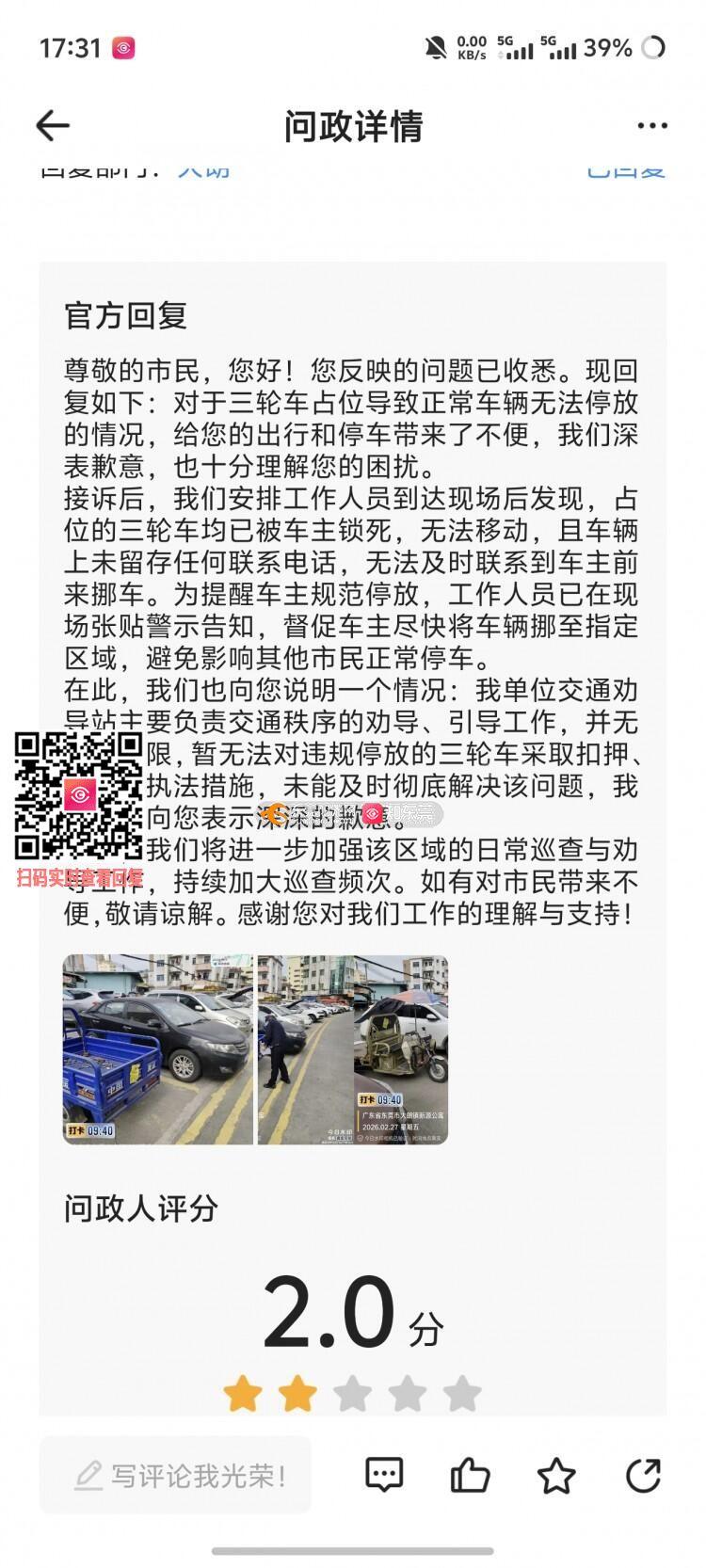 该问题已经多次反映,仍然得不到解决三轮车占位停车问题。希望有关部门能尽快解决此问题🙏能让有执法权的部门介入