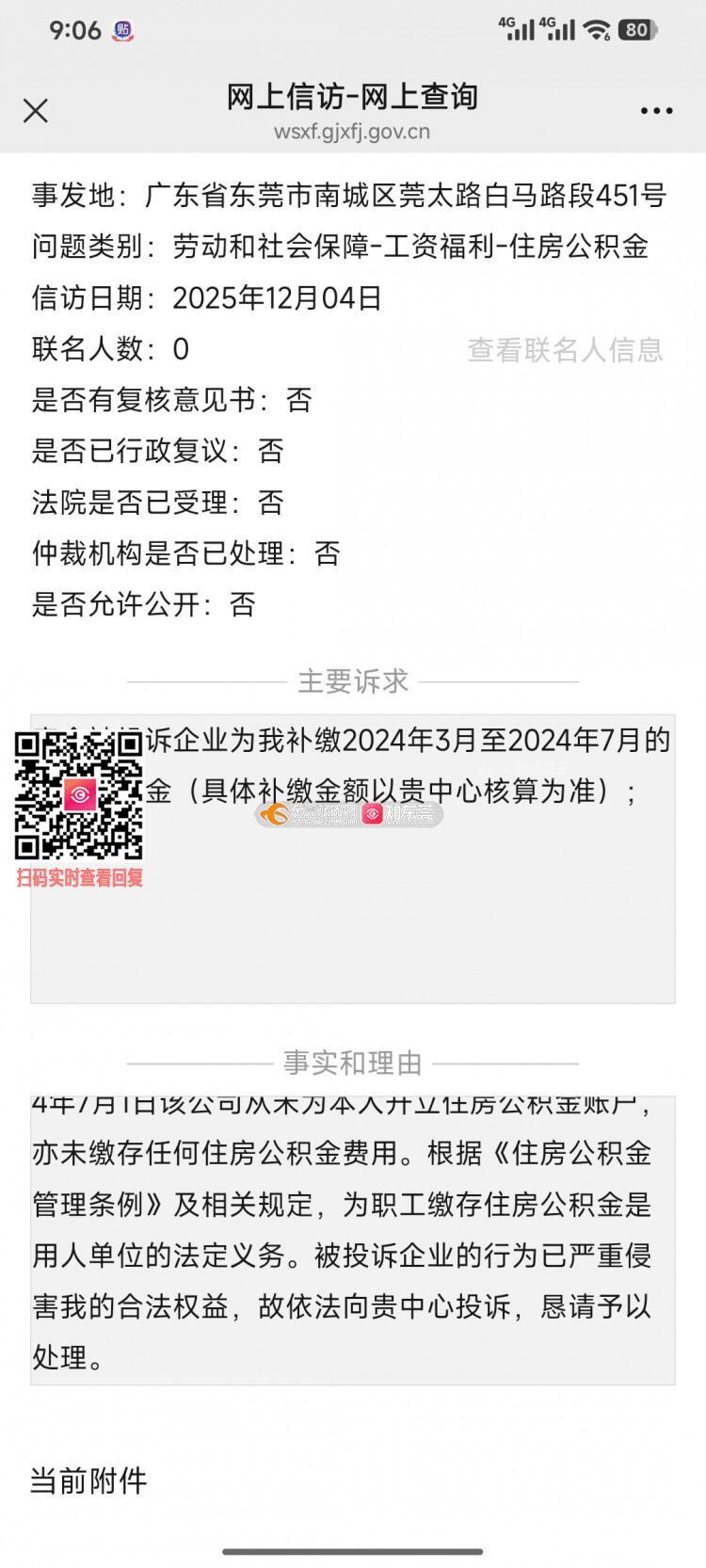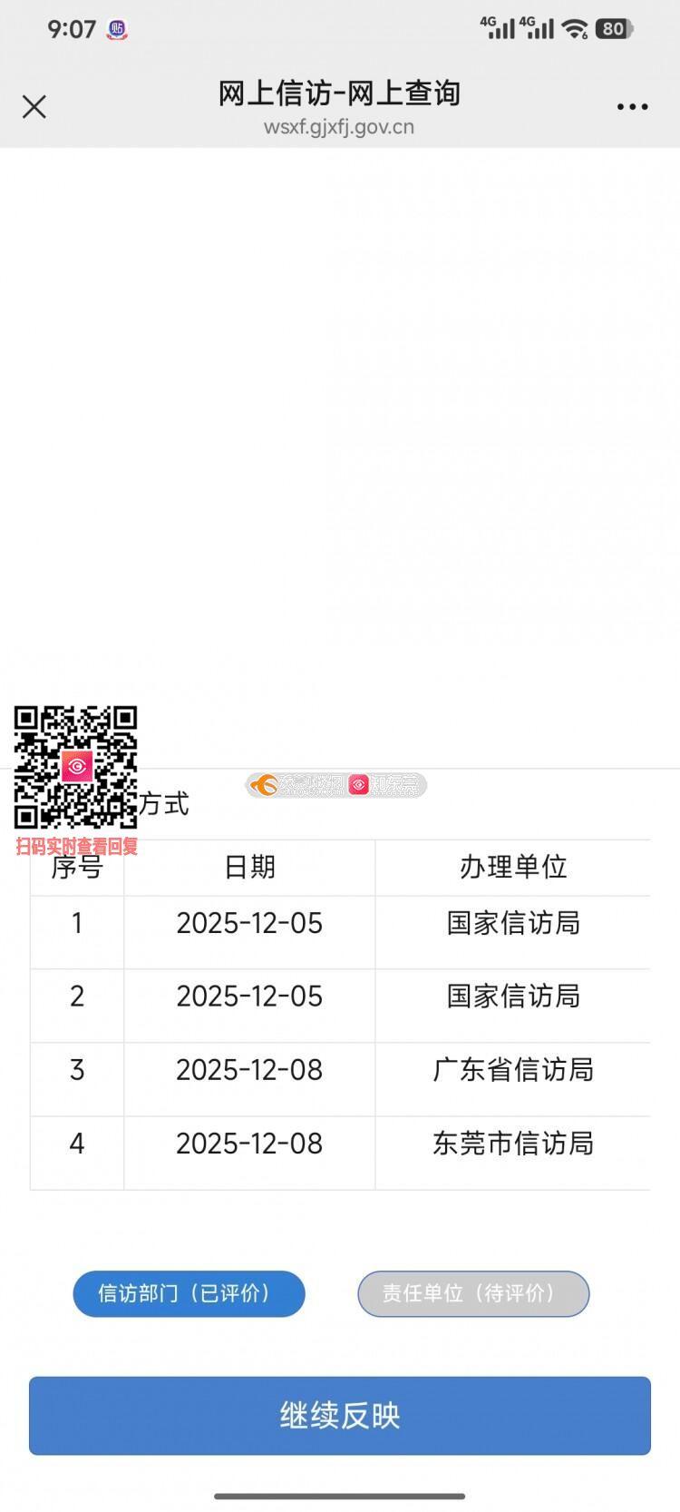 2025年12月04日提交信访事项,后续转交到东莞市住房和城乡。至今已经远超90天期限,没有任何答复。 法律依据:《信访工作条例》第三十六条规定,信访工作机构对无正当理由未按规定期限办结信访事项的行政机关应当及时督办。 未答复属于程序违法,申请责令限期回复并追究不作为、给予书面说明。