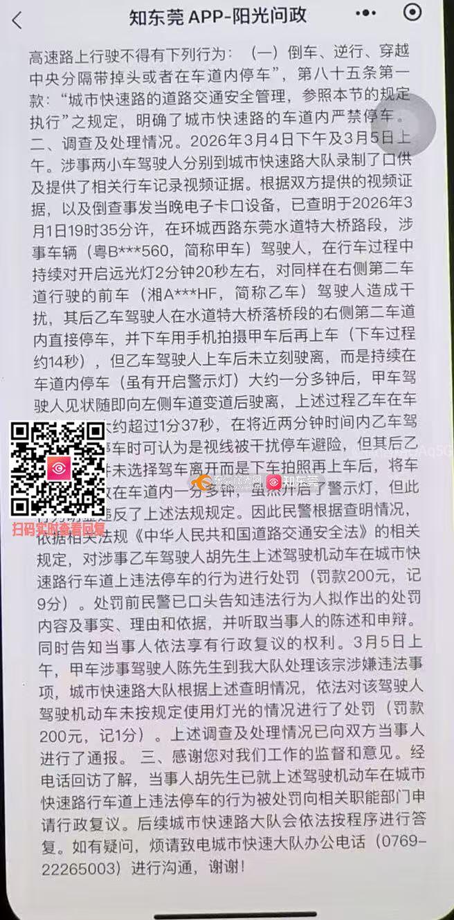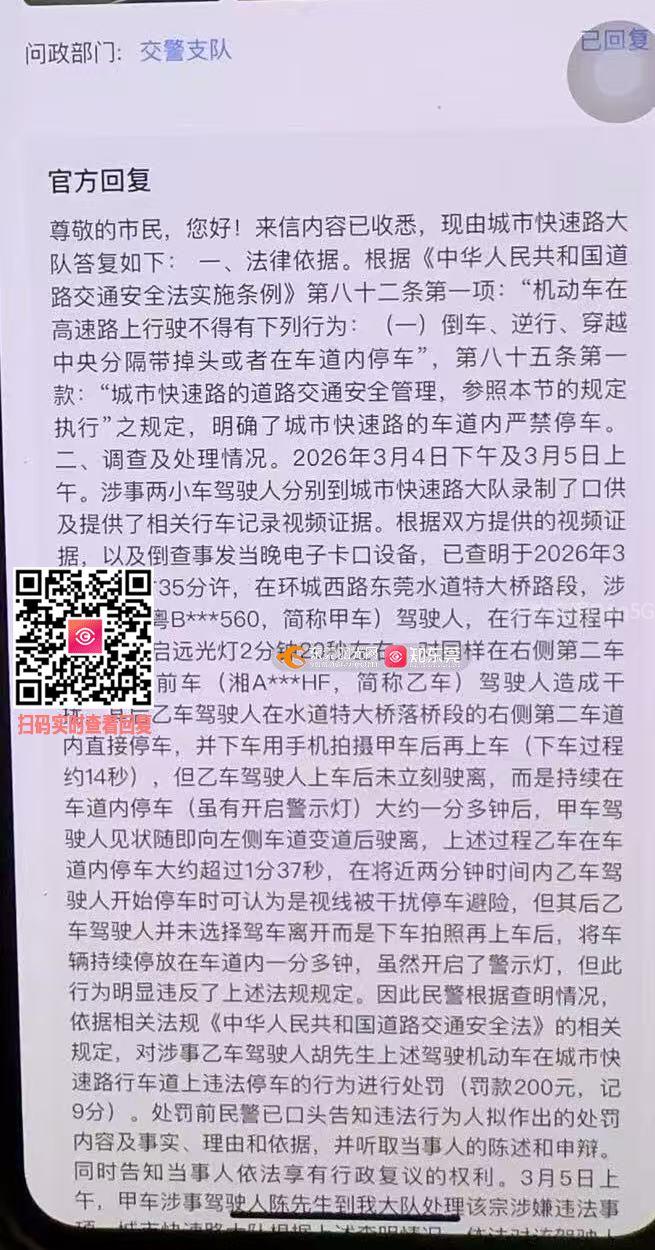 尊敬的交警支队领导: 您好!我对2026年3月1日在环城西路水道特大桥路段,因“城市快速路行车道上违法停车”被处以罚款200元、记9分的处罚决定,再次提出异议,恳请重新考量。 一、行为背景:后车违法在先,我是被迫应对 当日19时35分,我驾驶湘AHF号车辆在右侧第二车道正常行驶,后方粤B560号车辆持续开启远光灯长达2分20秒,强光直射后视镜,严重干扰视线,对我及车内乘员的行车安全构成直接、持续的威胁。为制止这一违法行为、固定证据以便后续举报,我才临时停车拍照留证,并进行自我身体缓解和安抚乘员。我的行为并非无端占道,而是在自身安全受到威胁时的必要应对。如果对方没有这个违法行为,我根本不会停车。 二、安全义务:已尽最大努力降低风险 停车时,我立即开启了车辆警示灯,下车拍照仅用约14秒,整个停车过程未超过1分37秒,属于取证所需的最短必要时间,并未长时间占用车道或对其他车辆通行造成明显妨碍。这与故意占道、长时间停车的行为,在主观目的和社会危害性上有本质区别。 三、处罚失衡:与行为性质不匹配 后车因未按规定使用灯光,仅被处以罚款200元、记1分;而我为制止违法、维护安全,却被处以罚款200元、记9分。这样的处罚结果,不仅让我个人难以接受,更与“鼓励市民举报交通违法”的治理理念相悖。当市民挺身而出维护公共安全时,却要付出如此沉重的代价,这无疑会打击更多人参与交通治理的积极性,让守法者寒心。 我理解城市快速路严禁停车的规定,但我的行为是特殊情况下的特殊应对,是为了制止违法、维护安全的必要之举。恳请领导重新审视本案,充分考虑行为的起因、目的和社会效果。