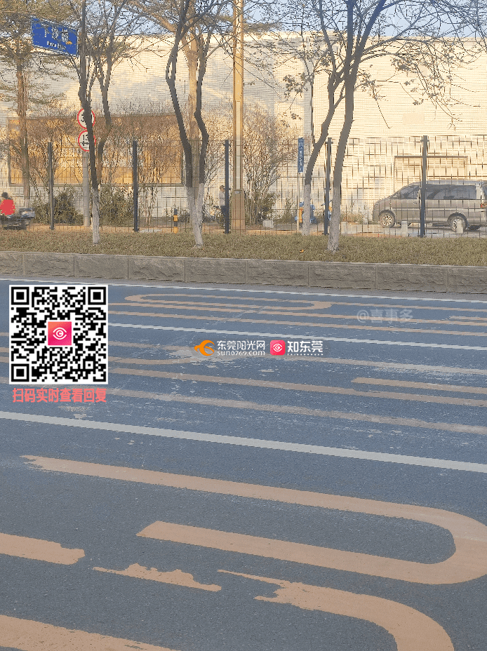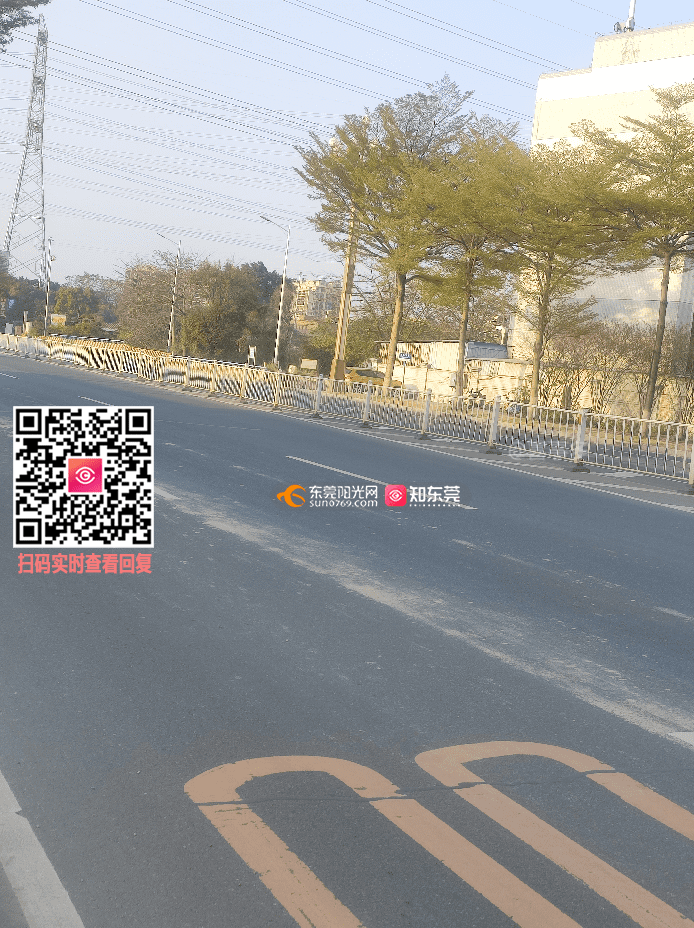 东莞市横沥康乐路进镇方向道路遗洒渣土,由于的渣土在路上 导致车辆经过时扬尘飘起,从而导致旁边的绿化带绿草上面也有较厚灰尘。