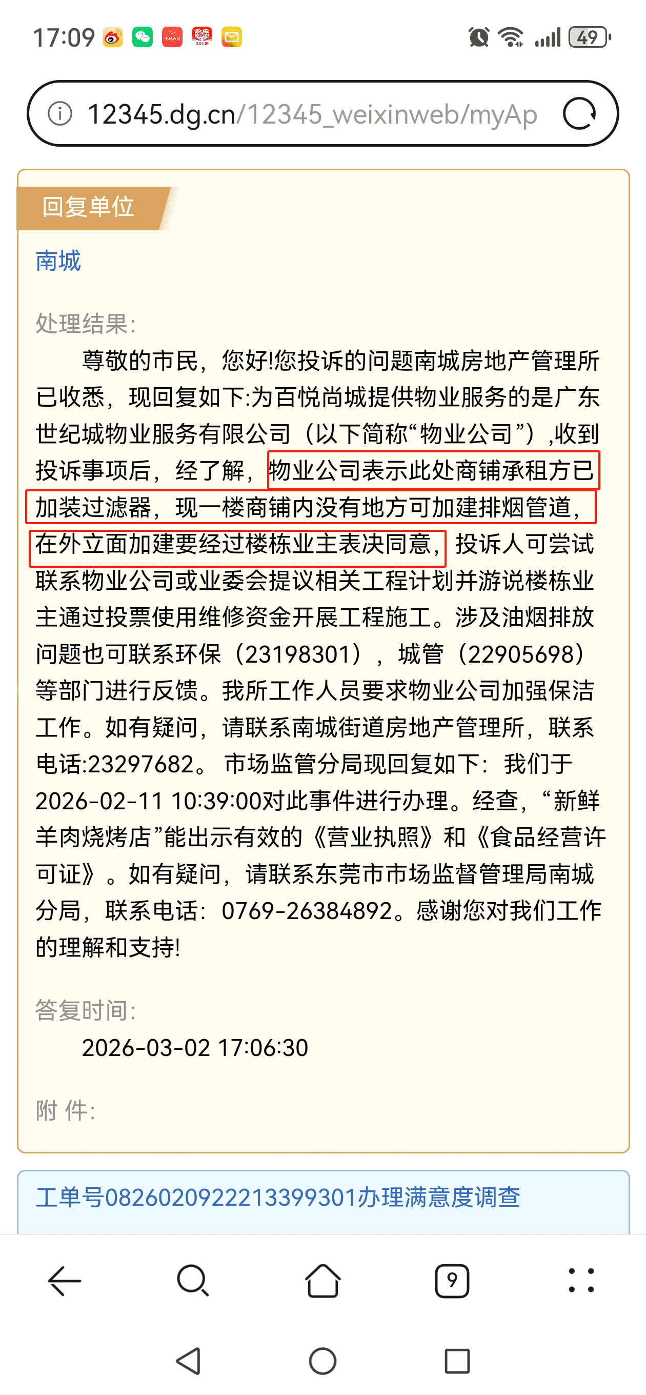 投诉内容: 尊敬的相关部门: 本人系东莞市东莞大道666号百悦尚城小区居民,现实名举报本小区内新鲜羊肉烧烤店(地址:东莞大道666号百悦尚城102商铺)存在严重违法经营及扰民问题,具体情况如下: 1. 该餐饮店所在商铺无专用油烟排放管道,属于居民住宅楼,根据《中华人民共和国大气污染防治法》第八十一条规定,严禁开设产生油烟的餐饮项目,该店属于违法经营。 2. 该店长期夜间经营至23:00后,属于夜间扰民时段(22:00—次日6:00),油烟直排、噪音大、人员喧哗,严重影响周边居民正常休息与生活环境。 3. 该店城管回复已加安装油烟净化设施,但是油烟气味没得到改善,直接向外排放,造成空气污染,小区数十人多次从2月9日至今多次向12345及物业投诉无果,扰民问题持续存在,群众意见极大。 基于以上事实,该餐饮店已违反大气污染防治、市容环境、夜间噪音管理等相关法律法规,侵害居民合法权益。 现恳请相关部门依法核查,责令该店立即停止违法经营,并对违法行为进行处罚,还居民安静、干净的居住环境。 日期:2026年3月7日