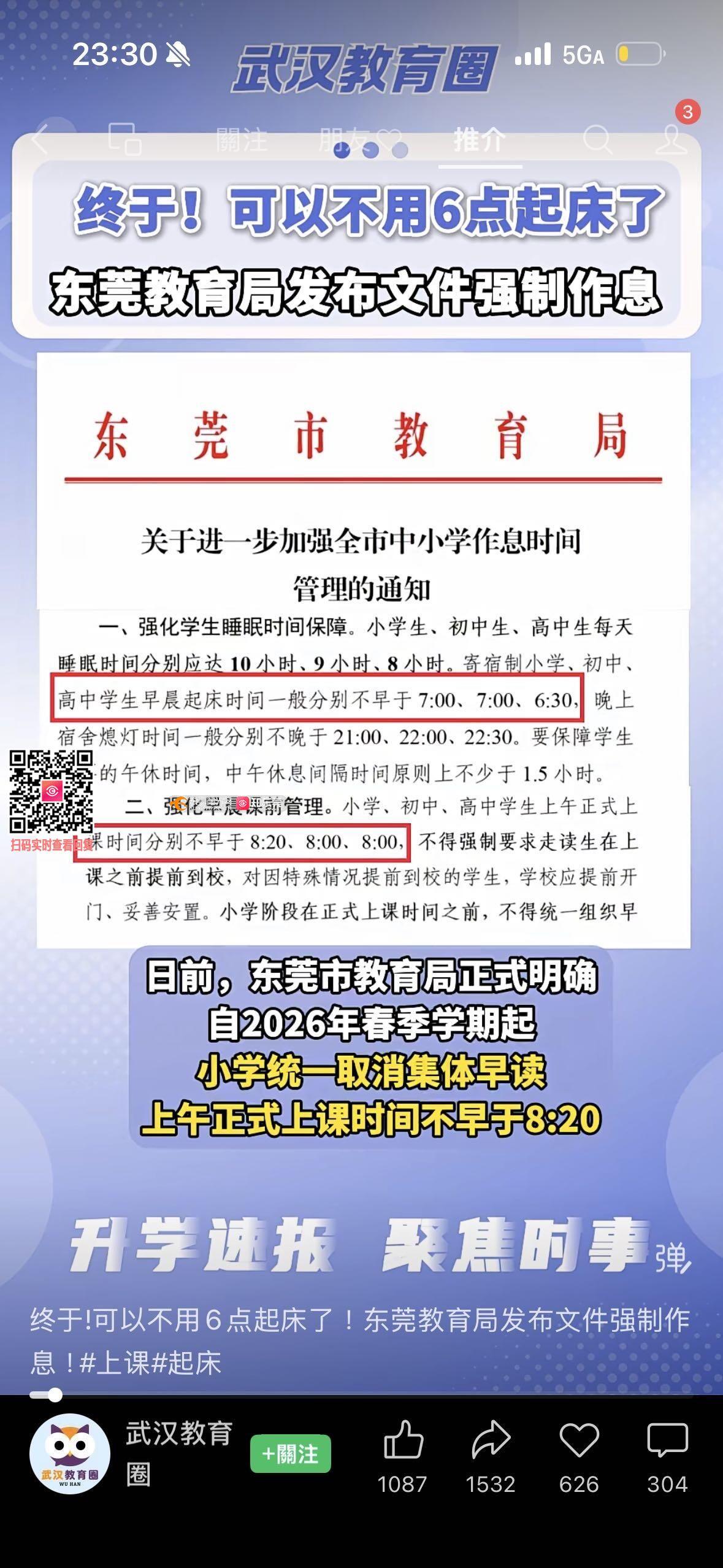 尊敬的市民:您好!您反映的情况已收悉,经麻涌镇教育管理中心核查,现回复如下:经查,东莞市嘉荣外国语学校高中部的作息时间安排符合省教育厅相关要求。针对您提出的问题,学校目前暂无调整早上起床时间的计划。接下来,麻涌镇教育管理中心将进一步加强对学校的监督与指导,以确保学校的作息时间安排持续符合规范,同时保障学生的身心健康与学习效率。如您仍有疑问或仍需反映相关问题,可致电麻涌镇教育管理中心,联系电话:0769-88823333;或东莞市嘉荣外国语学校,联系电话:15899684836。感谢您对我们工作的热心监督!