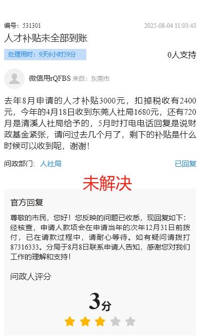 2024年申请的“莞能计划”至今未全到账,25年申诉过说是25年的12.31号前会打款,但是12月31号前打电话给清溪说镇的资金不足,剩下的700多不知道什么时候能有,是说未知的,一拖再拖,希望相关部门尽早解决此事!