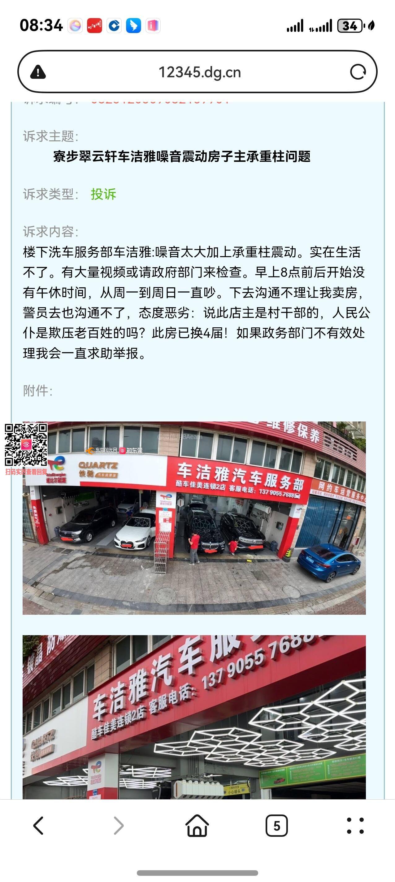 居民楼下商铺长期违规经营洗车业务,严重扰民。 投诉地址:东莞市横坑翠云轩车洁雅汽车服务部 该商铺在居民楼下长期从事经营性洗车,存在以下问题: 1. 洗车机、高压水枪噪音巨大、震动强烈,从早到晚持续不断,严重影响楼上及周边居民正常休息、生活与身心健康。 2. 存在污水乱排、占道作业等问题,影响居住环境与公共卫生。 3. 居民楼下从事经营性洗车,不符合相关规划与环保要求,属于违规经营。 现恳请相关部门依法核查: 1. 核实该商铺是否具备合法合规的洗车经营资质与环保审批。 2. 对噪音、震动、污水排放进行现场检测与查处。 3. 依法责令其停止在居民楼下违规洗车经营,还居民正常、安静、安全的居住环境。 请相关部门尽快处理并书面回复处理。