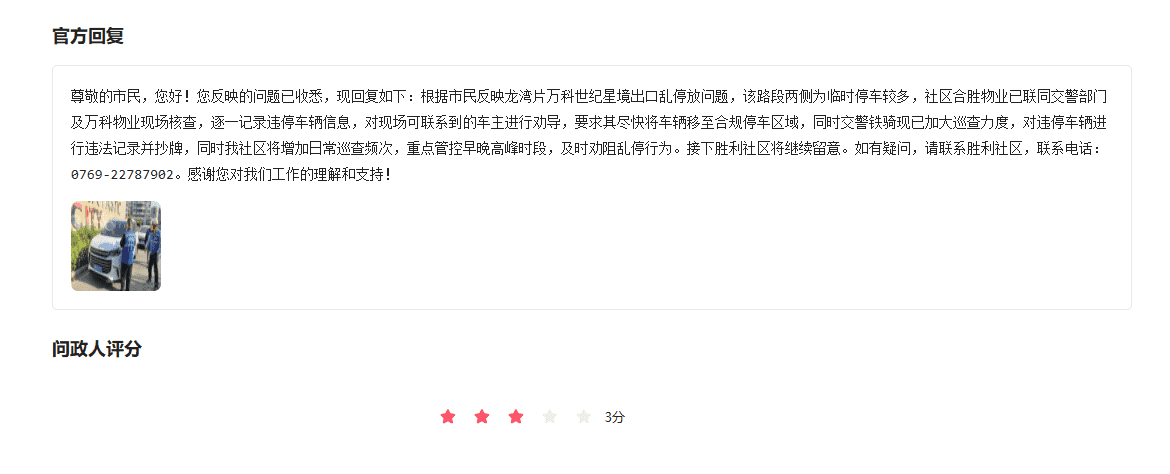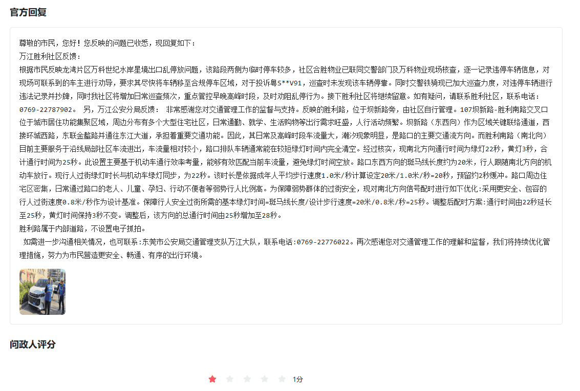万科中天世纪水岸(星境)门口胜利路口违停,交警的不作为,社区的横行霸道! 最终导致3月2日下午发生了交通事故,事故发生以后,交管也是不予管理,社区更是踢皮球,万江胜利路的违停车辆根本没有减少,不就是因为交警的不管制,社区的横行霸道,导致了事故发生饿了吗? 但政务翻开之前市民投诉的问题(编号:559390编号:559968),下面的官方回复竟是同一张照片,政务人员用同样的一份材料照片,简单随意回复市民的问政问题,作为政府机关人员,把市民的担忧仅用一次的信访来处理问题,反馈的是万江街道政务服务人员全体的工作态度吗?还是单方面的行为呢?是跟胜利社区的人员有某种不可告人的好关系?需严查!!!!