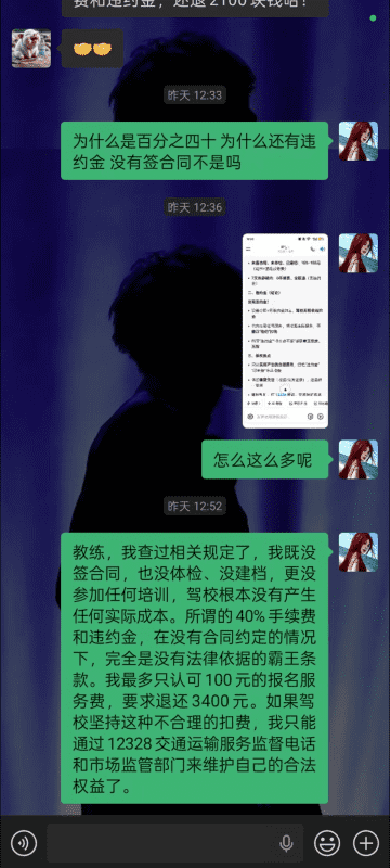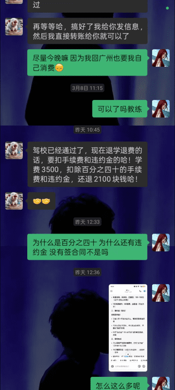 投诉天明驾校恶意拖延退费、乱收40%服务费违约金,请求24小时内全额退还3500元