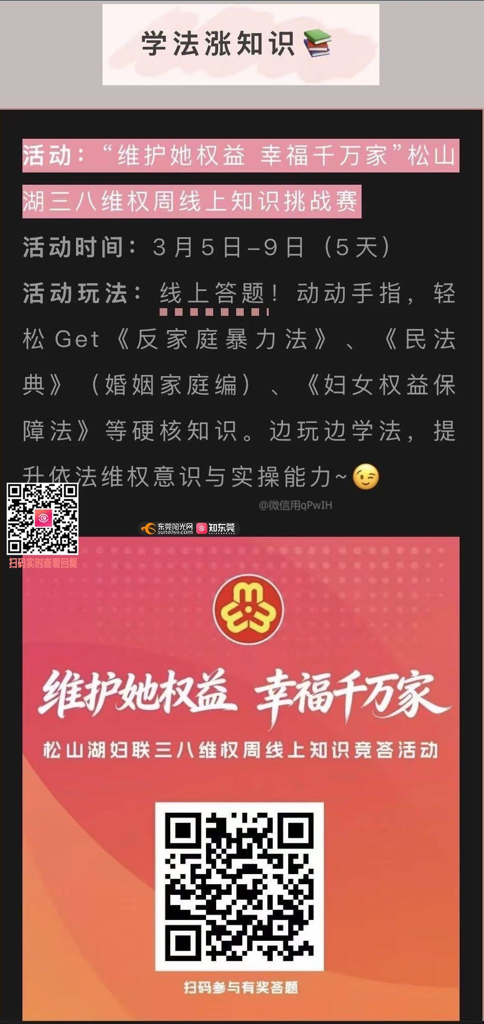 尊敬的市民,您好!您的来信已收悉,现回复如下:收到反映的情况下,我办分别于3月12日14:23、14:30、16:30及3月13日8:55分致电当事人,均无人接听。松山湖三八维权周线上知识挑战赛的正式开展时间为2026年3月5日至9日。为宣传松山湖“三八”妇女节系列活动,3月3日晚上8点27分,公众号“创新松山湖”发布了题为《花开三月,只等你来!松山湖“三八”妇女节超全活动剧透→》的推文,其中第三项内容即为本次线上知识挑战赛的活动预告,并已明确标注活动时间为3月5日至9日。3月5日早上8点04分,该公众号再次发布题为《学法赢好礼!松山湖这场“她权益”挑战赛,等你来战!》的推文,对活动进行正式官宣,同样清晰注明活动时间为3月5日至9日(共5天)。 在正式活动开始前,答题系统处于内部测试阶段。为确保活动期间系统的稳定性和流畅性,测试阶段设置了100%中奖的测试环境。3月4日上午9点43分,所有测试阶段生成的数据(含中奖记录)均已全部清除。数据清除后,不存在测试记录留存或对后续正式答题及中奖结果造成影响的情况。对此给您带来不好的体验,我办深表歉意。如还有疑问,请致电松山湖党建工作办公室,联系电话:0769-22891181,感谢您对我们工作的理解与支持!