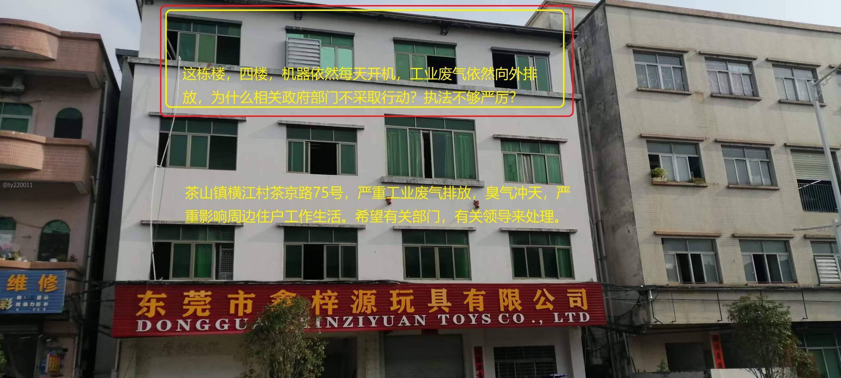 向有关政府部门,相关领导,强烈投诉,此前相关部门已经前来检查,但是,没有任何效果,厂家老板根本没有整改,严重工业废气污染,依然存在!!每天依然臭气冲天,尘埃满天飞。茶山镇横江村茶京路75号,四楼,严重工业废气排放,臭气冲天,严重影响周边住户工作生活。希望有关部门,有关领导来处理,必须要严惩厂家。