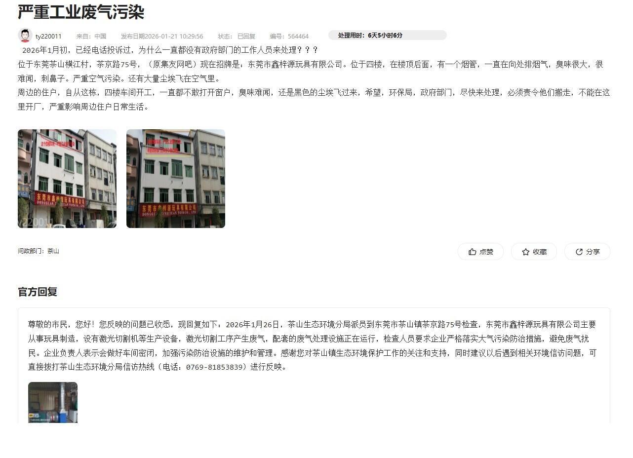 尊敬的市民,您好!您反映的问题已收悉,现回复如下:2026年3月17日,茶山生态环境分局派员到事发地点检查,东莞市鑫梓源玩具有限公司主要从事玩具制造,设有激光切割机等生产设备,激光切割布料产生废气,已配套活性炭废气处理设施,检查人员要求企业定期维护废气处理设施,避免废气扰民,企业负责人表示会尽快更换活性炭。已致电您说明处理情况,茶山生态环境分局将继续跟进此案件。如有疑问,请联系茶山生态环境分局,联系电话:0769-81853839。感谢您对我们工作的理解和支持!