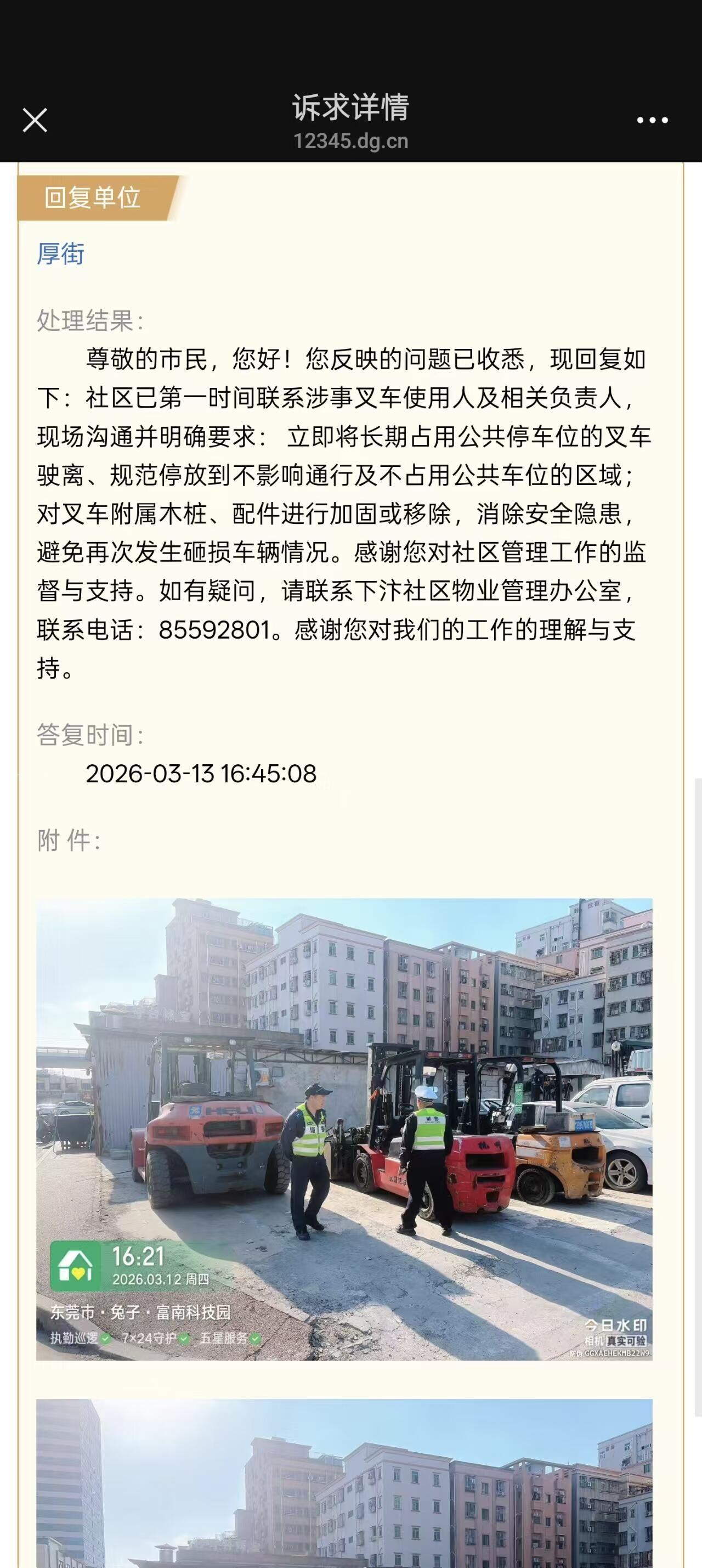 上周投诉叉车在:厚街镇下汴村下汴四区五巷与下汴汴康路交叉路口,乱停乱放公共车位,工单编号:28030720325126901,相关单位执法以走形式潦草处理问题。没有正面解决问题,难道这就是公干人员做的事情吗?纳税人的钱就这样给他们发工资吗?相关管理单位没有核实吗?
