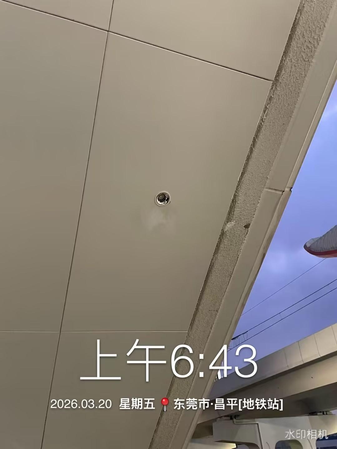 地铁1号线昌平站B1出口楼梯顶棚天花板施工标记未清理,有碍观瞻。