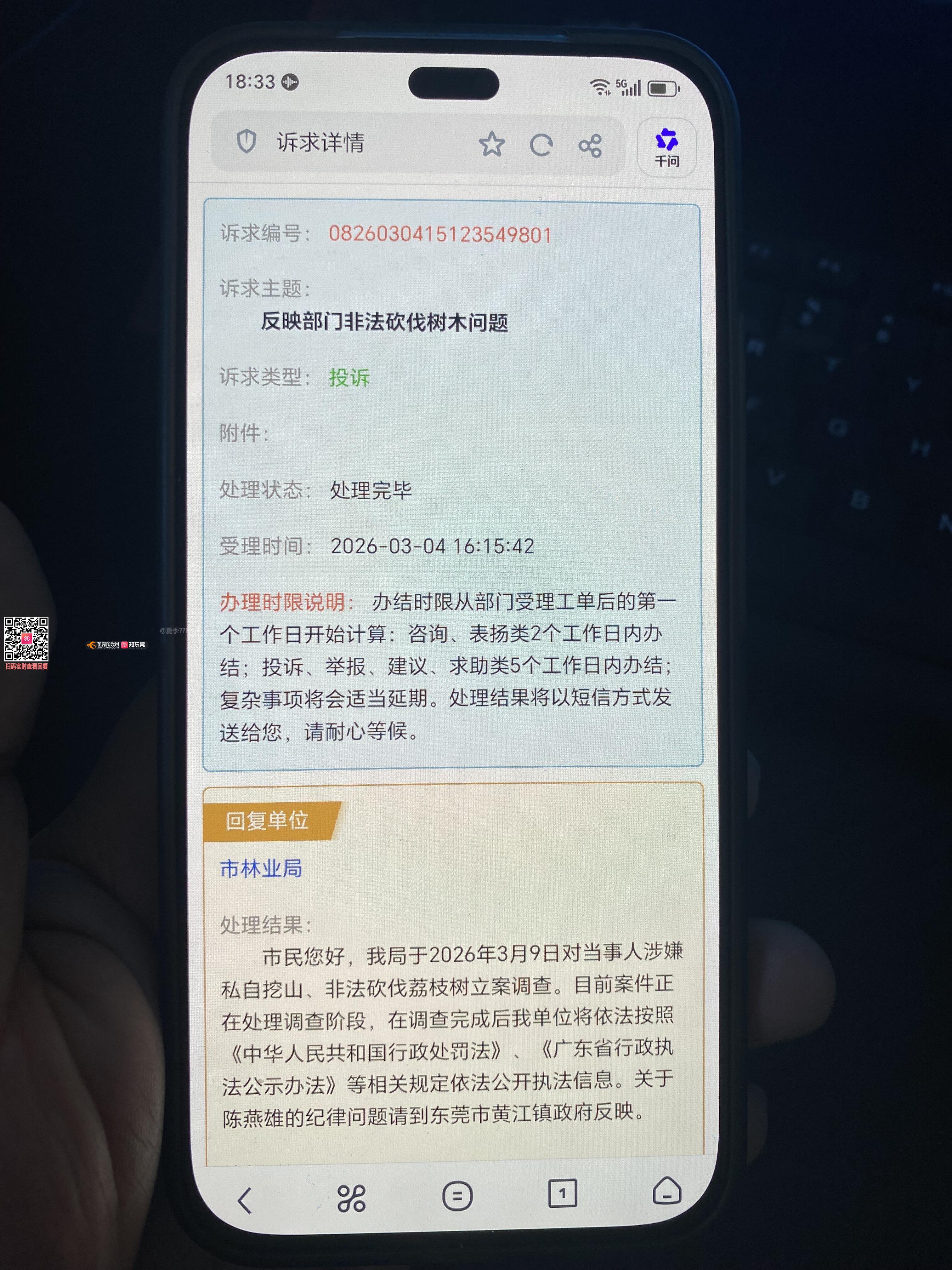 尊敬的市民,您好,您反映的问题已收悉,现就相关情况回复如下:一、东莞市政务服务便民热线回复:经技术人员排查,该情况与浏览器的缓存有关,建议您清除浏览器缓存后进行尝试。经复核,关于您反映的工单(编号:0826030415123549801)重办后的“处理结果满意度评价”状态为“未评价”。满意度评价短信自系统发出后72小时内有效。下来,我们将持续优化系统功能,也请您继续关注我们的服务,给我们提出宝贵建议,以不断提升我们的服务质量。感谢您对热线的监督和支持!二、东莞市林业局回复:3月9日市林业局对该案件立案后,已督促当事人开展整改复绿工作。下一步,我们将严格按照相关规定,督促当事人按标准、按要求完成全面补植复绿。相关整改情况我们会持续跟进,感谢您的监督与关注。