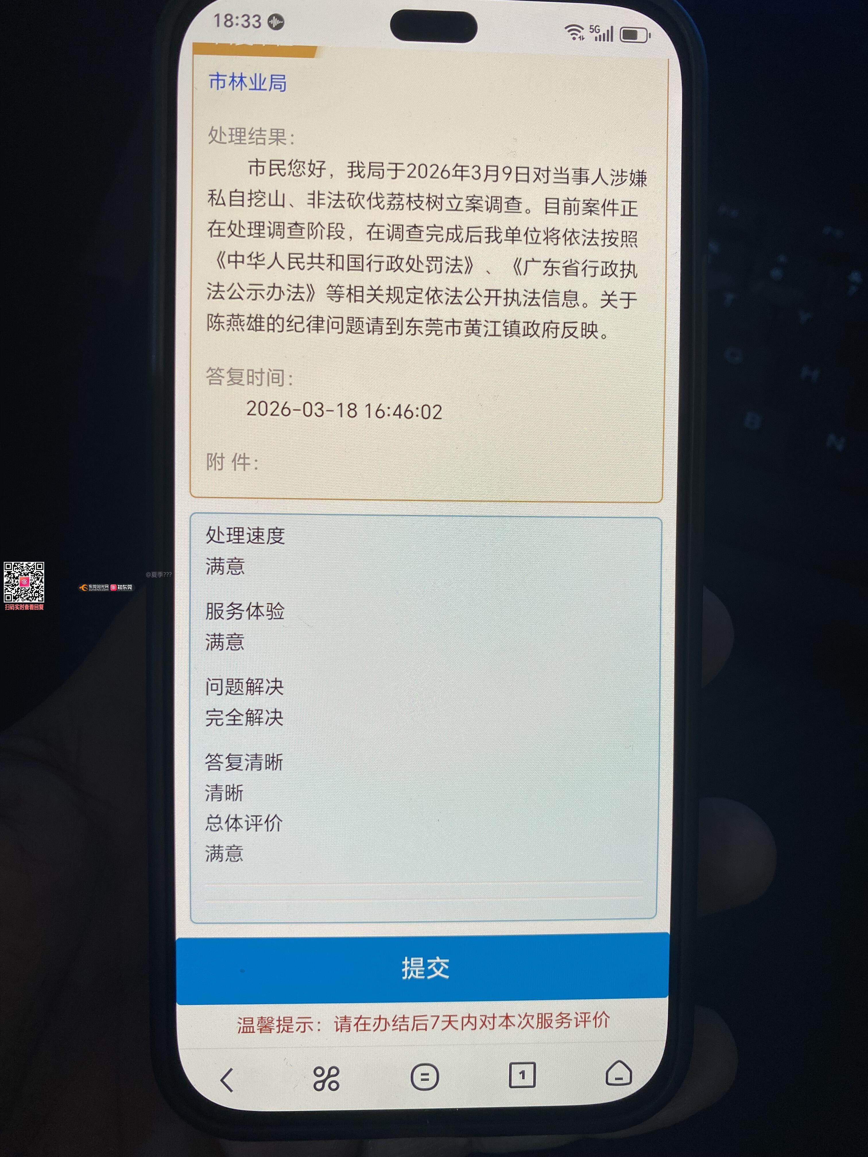 手机收到东莞市林业局工单回复,点击进去没得按照个人意愿给出评论的