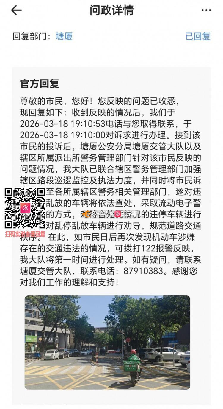 塘厦四村康湖街与康湖横街交界处,车辆在路口乱停乱放,康湖横街乱停放占整条车道。投诉塘厦交警不处理不作为,敷衍了事,回复图片不是投诉路段。