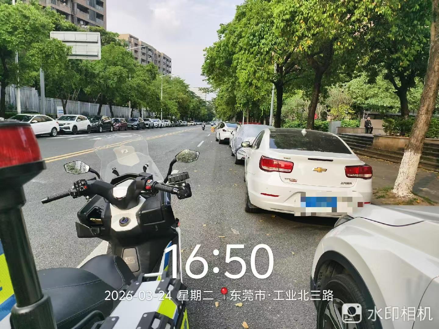 松山湖工业北三路,机动车乱停车都快停路中间爽黄线上了,没错路过都要逆向压双黄线行驶,稍微有大一点的车,都无法错车造成拥堵,松山湖交警到底有没有认真管理巡查啊。