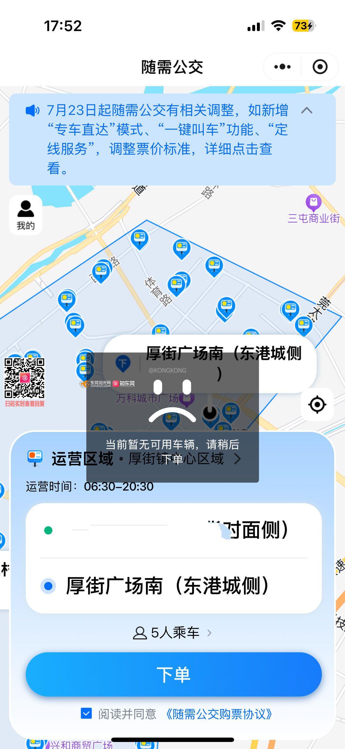 东莞公交和随需公交形同虚设。周六傍晚跟家人外出,打算坐公交一同出门,怎么知道整个公交线路上只有一辆车,然后下一辆不知道什么时候才有车。另外,本想改坐随需巴士出行,一查看服务区域内,完全没有车辆调配,电话咨询960163热线表示不会有车服务。既然没有车辆服务百姓出行,你设置这个随需巴士干嘛??纳税人缴纳了税,却享受不了公共服务??这是公交公司把钱吃光了么?