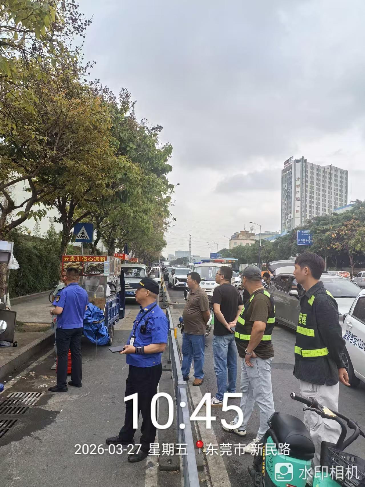 您好!东莞市长安镇新民路188号至品质路与新民路交叉口区域,固定时间段中午11点-12点,晚上5点半-6点半,通勤车道及人行道长期存在流动快餐摊贩占道经营,堵塞行人道正常通行,摊位周边油污,垃圾遍地,卫生脏乱差问题,不仅严重影响市容市貌,也对周边居民、过往车辆及行人的出行安全造成较大影响。 恳请相关部门及时前往现场核查整治,清理垃圾杂物,维护良好的道路环境与通行秩序,谢谢!