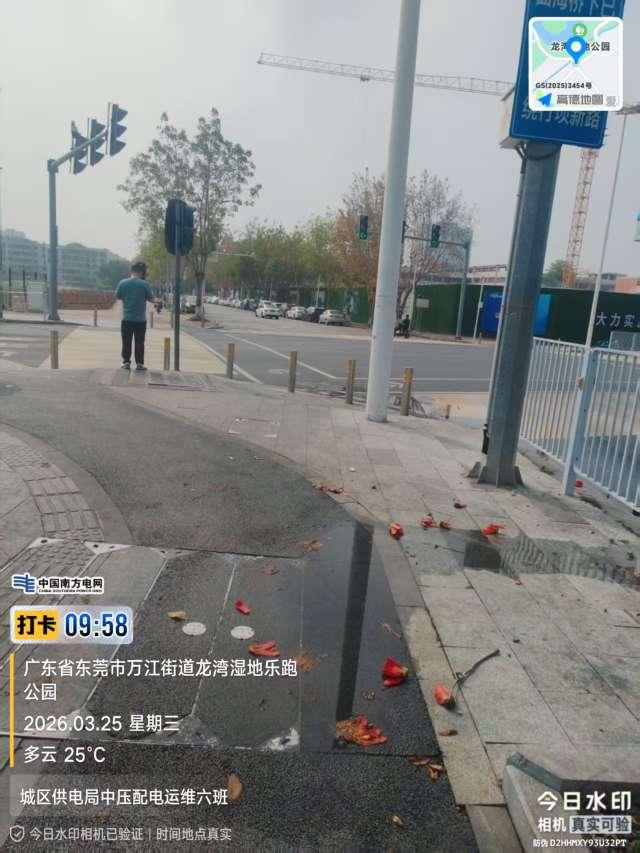 万江龙湾湿地公园红绿灯人行道污水井盖跑水,影响行人通行。已经好久了。