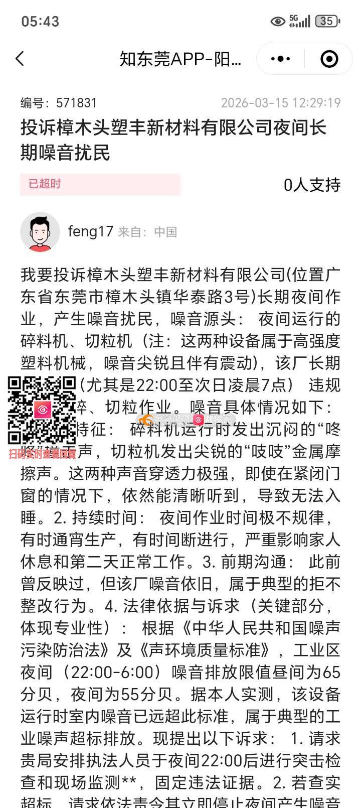 我要举报樟木头环保分局行政不作为。我两次举报塑丰新材料有限公司,地址:樟木头镇华泰路3号,工厂夜间噪音,第一次回复没数据就办结,第二次超时没处理。工厂长期夜间生产严重扰民。我现在要求把投诉升级为督办件,24小时内必须有人到现场执法,并向我反馈结果。” 我要打打12388(纪检监察):我要反映樟木头环保分局不作为。工单号571831的投诉超期未处理,夜间噪音持续几个月没人管。请你们核查。”我会持续逐级或越级向上级举报。