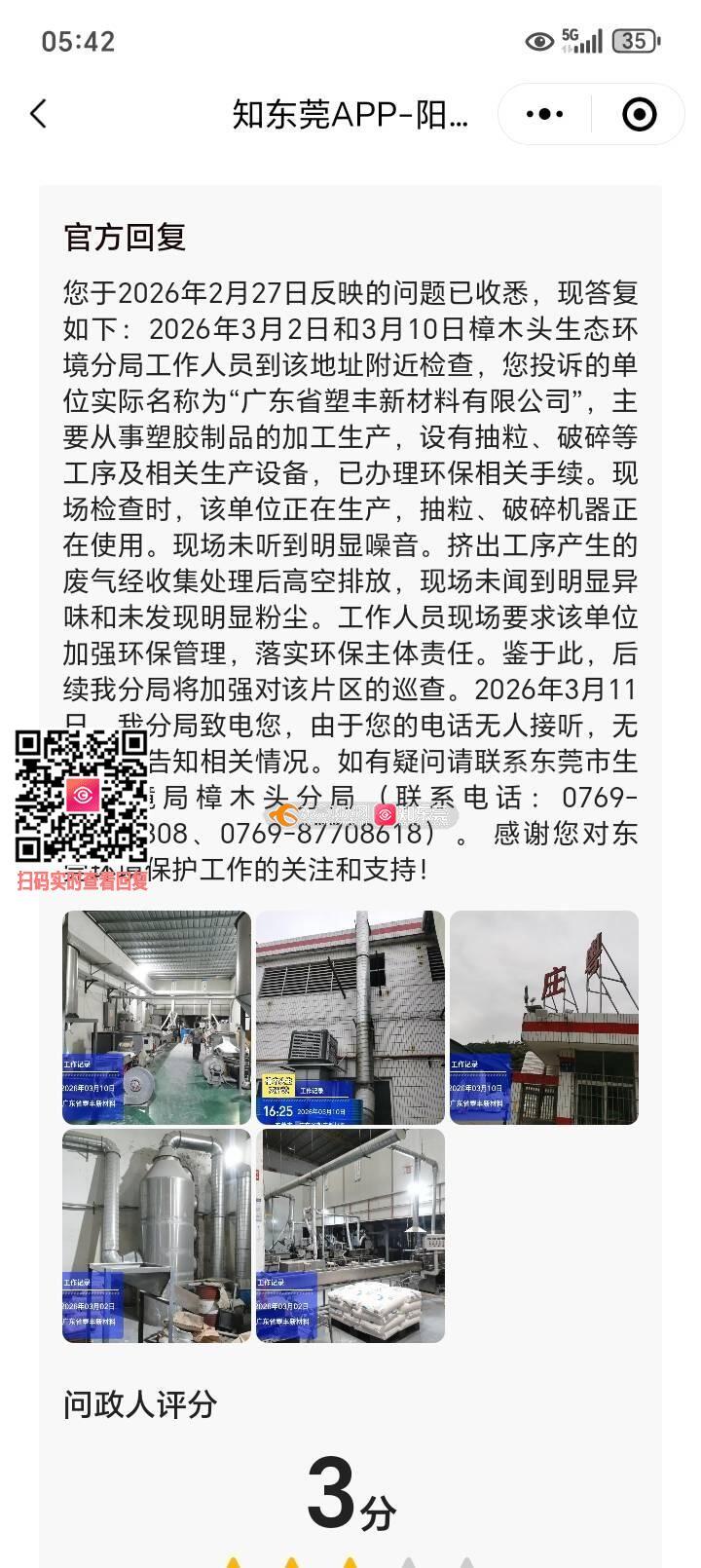 您反映的问题已收悉,现答复如下:2026年3月25日樟木头生态环境分局工作人员到该地址附近检查,您投诉的单位实际名称为“广东省塑丰新材料有限公司”,主要从事塑胶制品的加工生产,设有抽粒、破碎等工序及相关生产设备,已办理环保相关手续。现场检查时,该单位正在生产,抽粒、破碎机器正在使用。现场未听到明显噪音。根据该单位噪声检测报告(STJC26030646)显示检测结果为达标,符合《工业企业厂界环境噪声排放标准》GB12348-20083类排放限值的标准。工作人员现场要求该单位加强环保管理,落实环保主体责任。关于您反映的“樟木头环保分局行政不作为”“超时没处理”等问题,经核查,情况不属实,樟木头生态环境分局工作人员对市民投诉举报的问题依法依规进行处理,保证廉洁、公正处理信访案件,积极接受企业、信访人的共同监督。根据东莞工单管理规定,投诉举报类事项的基础办理时限为5个工作日,因情况复杂,需现场核查协调问题,办理周期稍有延长,此类事项最长办理时间为15个工作日,我分局已按程序办理。2026年3月31日我分局致电联系您,由于您的电话无人接听,无法联系告知相关情况。鉴于此,后续我分局将加强对该片区的巡查。如有疑问请联系东莞市生态环境局樟木头分局(联系电话:0769-87715308、0769-87708618)。 感谢您对东莞环境保护工作的关注和支持!