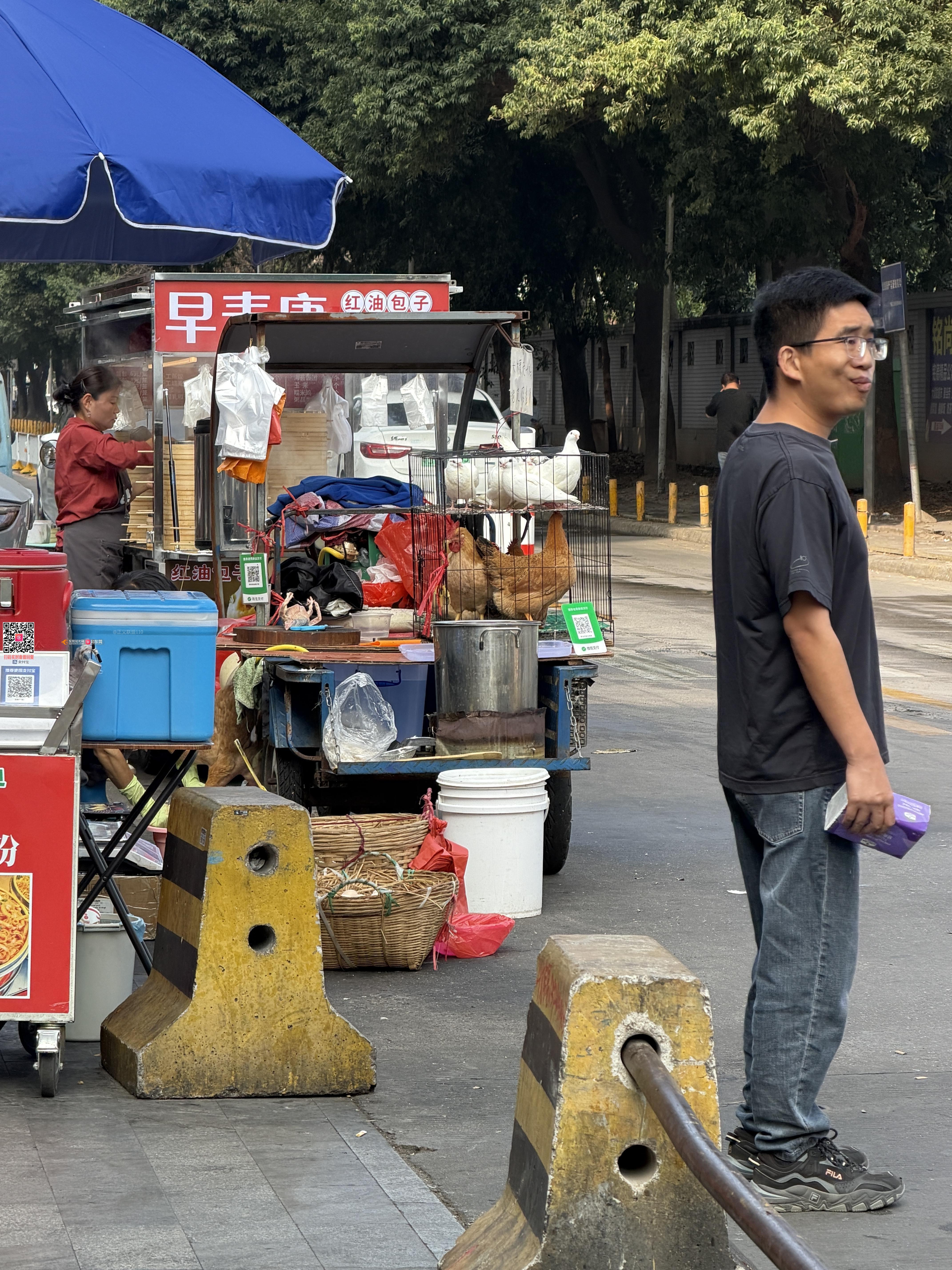 现在不止下午和晚上阻碍交通了。大早上买早餐和卖鸡仔鸽仔的都来了