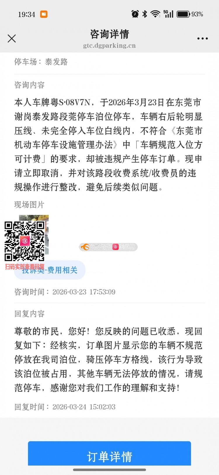 东莞市谢岗泰发路段莞停车泊位停车,车辆右后轮明显压线、未完全停入车位白线内,不符合《东莞市机动车停车设施管理办法》中「车辆规范入位方可计费」的要求,却被违规产生20元停车订单。现申诉全额退费,并对该路段收费系统收费员的违规操作进行整改,避免后续类似问题。