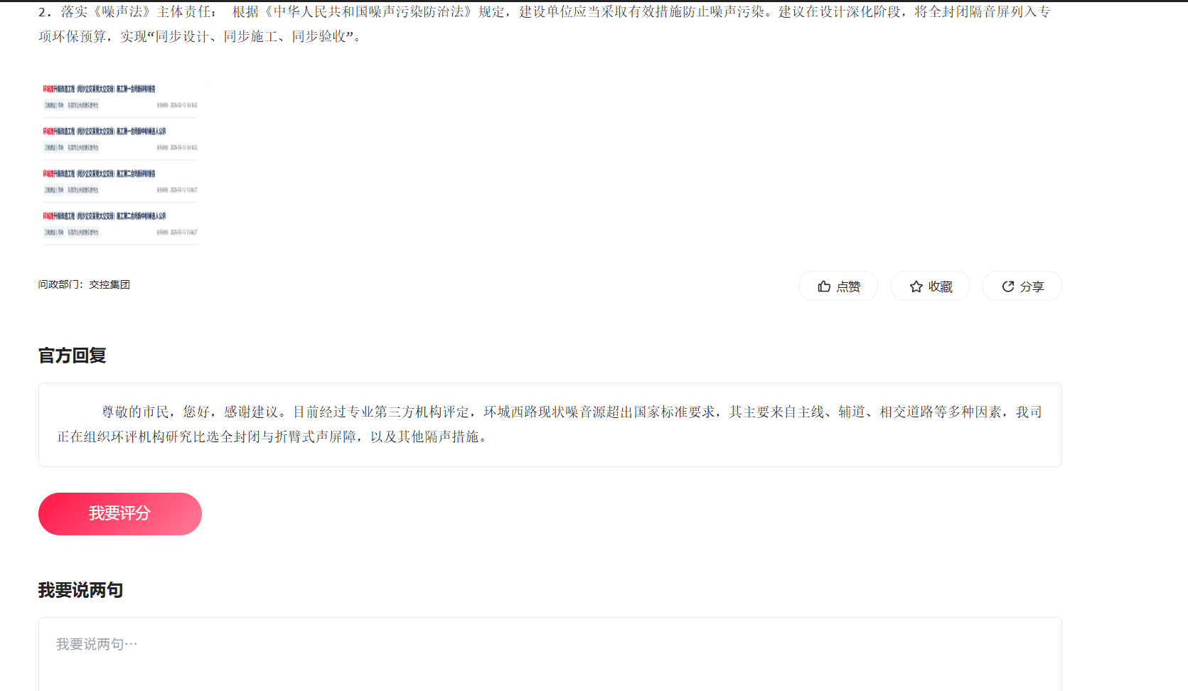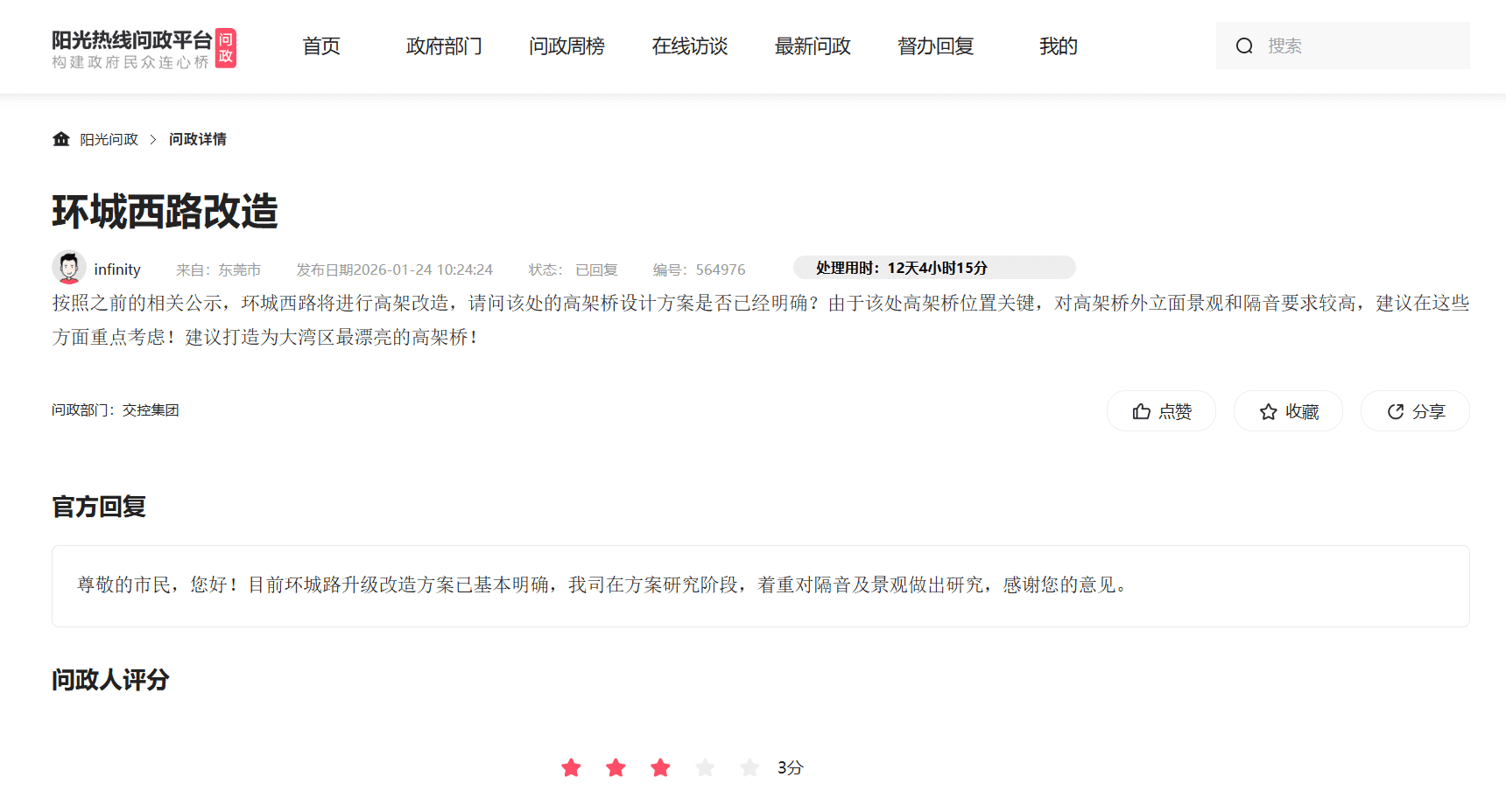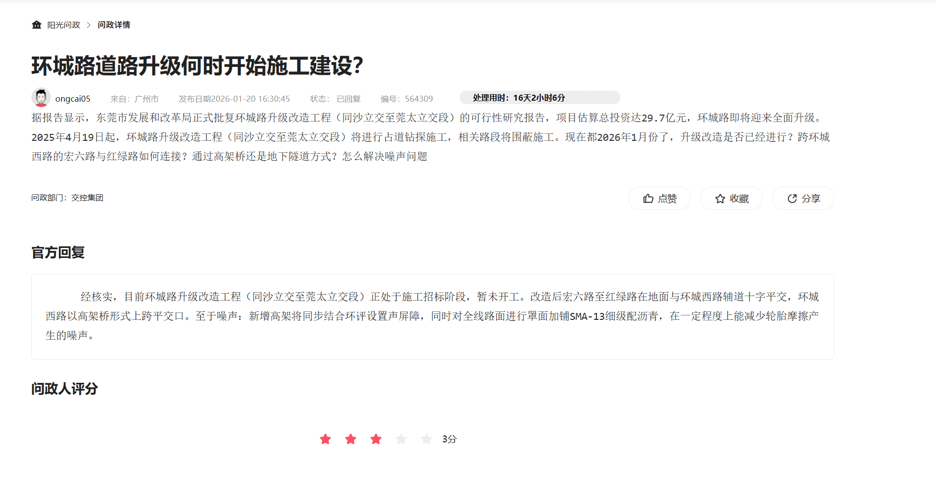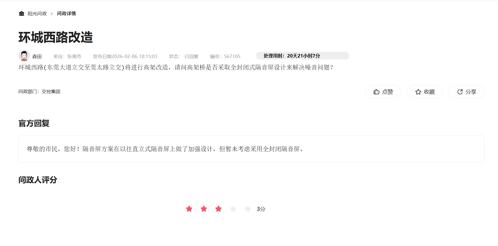 交投在今日答复中公开透明地承认“环城西路现状噪音源超出国家标准”(问政编号:572147),作为主管生态环境的部门,该现状持续的时间已经长达多年(阳光问政可以搜索到大量关于环城路噪音的投诉和建议),一直未得到妥善的处理,我相信此次的改造升级,东莞政府也考虑到了这一方面的原因,城市的发展,未能在一开始就考虑的全面周到,但是在环城西路升级改造的这么一个重要时间节点,恳请贵局肩负起应有的职责,希望此次施工中不仅考虑短期建设造价,更要考虑民生健康成本与长期环保效益,真正做到"还静于民" 同时基于交投提到的“全封闭与折臂式声屏障比选研究”,作为长期深受其影响的片区业主,现提出以下针对性反馈意见,在环评比选过程中予以严谨论证: 1. 科学正视“高层噪音绕射”:为何折臂式是徒劳? 以往的方案提到的“折臂式声屏障”在物理性能上仅能解决低层(1-5层)的声影区问题。但环城西路段两侧均为30层以上的超高层住宅群(如中信凯旋、幸福公馆等) 物理现实: 噪音具有向上绕射特性。折臂式屏障对于中高层住户而言,几乎徒劳 核心诉求: 若仅采用折臂式,即便新路建成,高层噪音超标现状仍无法根治。唯有全封闭式隔音隧道能实现全维度包络,彻底阻断声波向上扩散。 2. 明确“比选”数据的透明度: 既然环评机构正在对比选方案进行研究,建议贵局监督在最终定案前,向社会公示比选数据 3. 针对“多种因素”噪音的统筹解决 我们已知环城西路新建特大桥路段路段,已经有折臂式隔音设备,但答复中提到噪音来自主线、辅道及交叉路口。这恰恰证明了局部、分散的隔音设施(如折臂式)难以奏效。