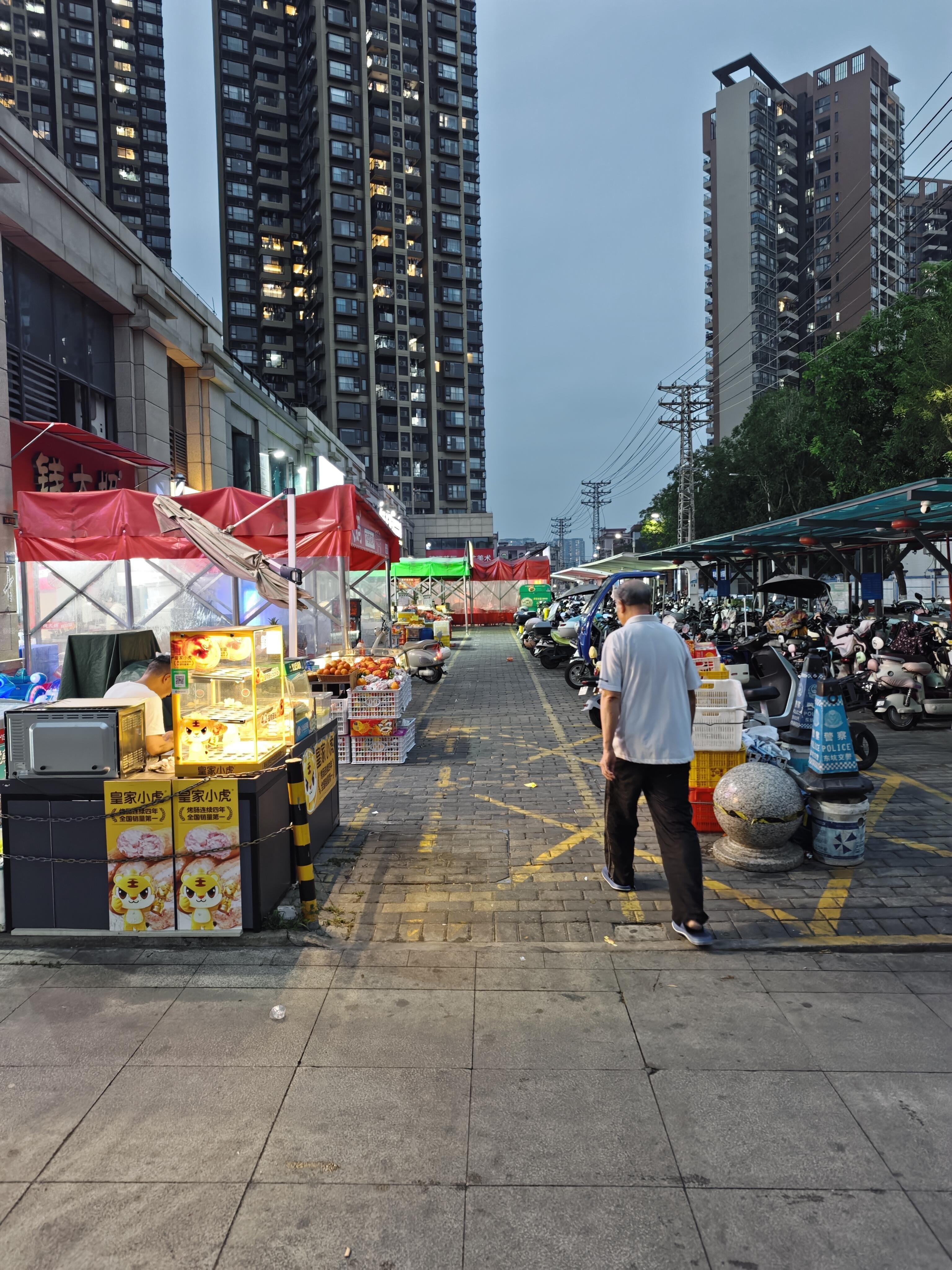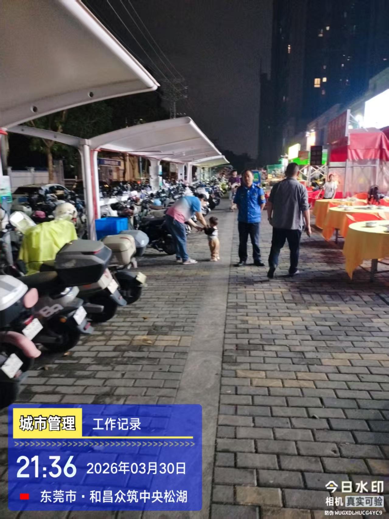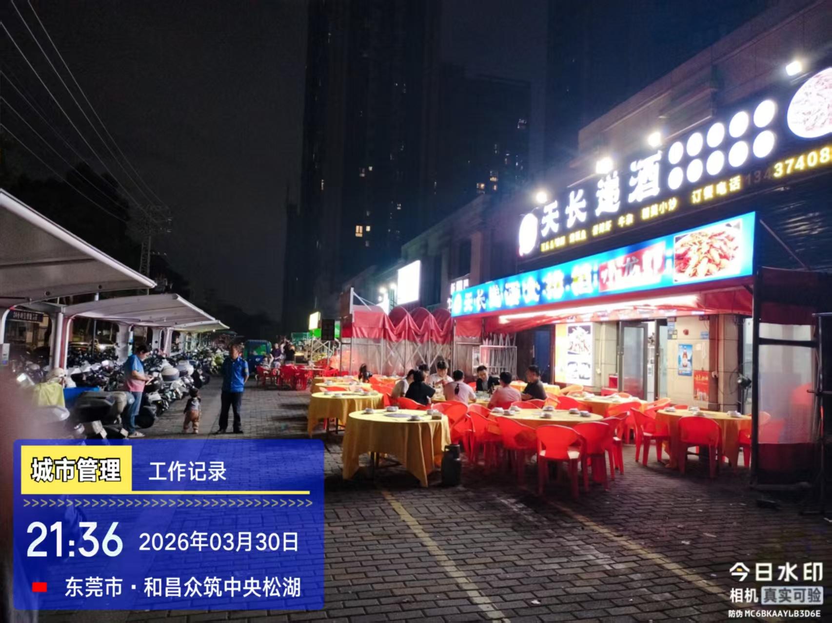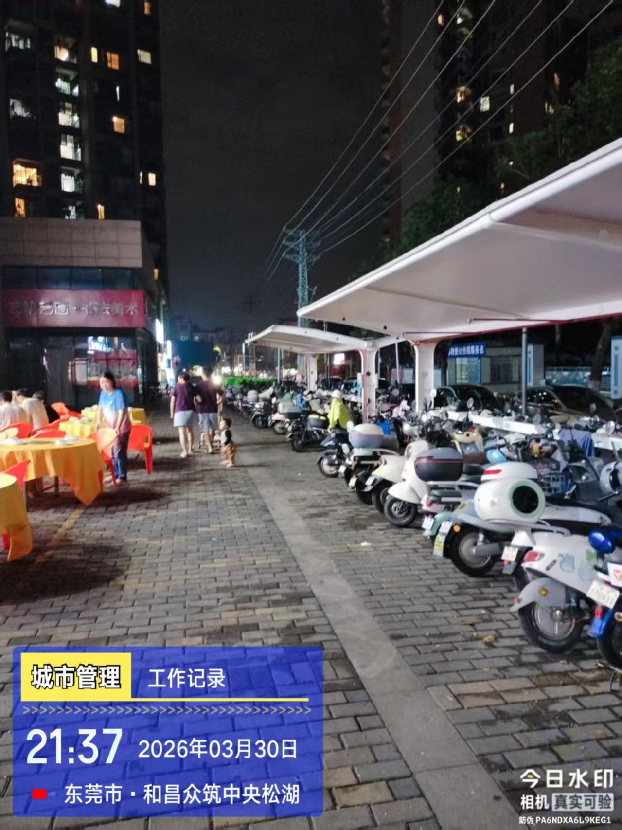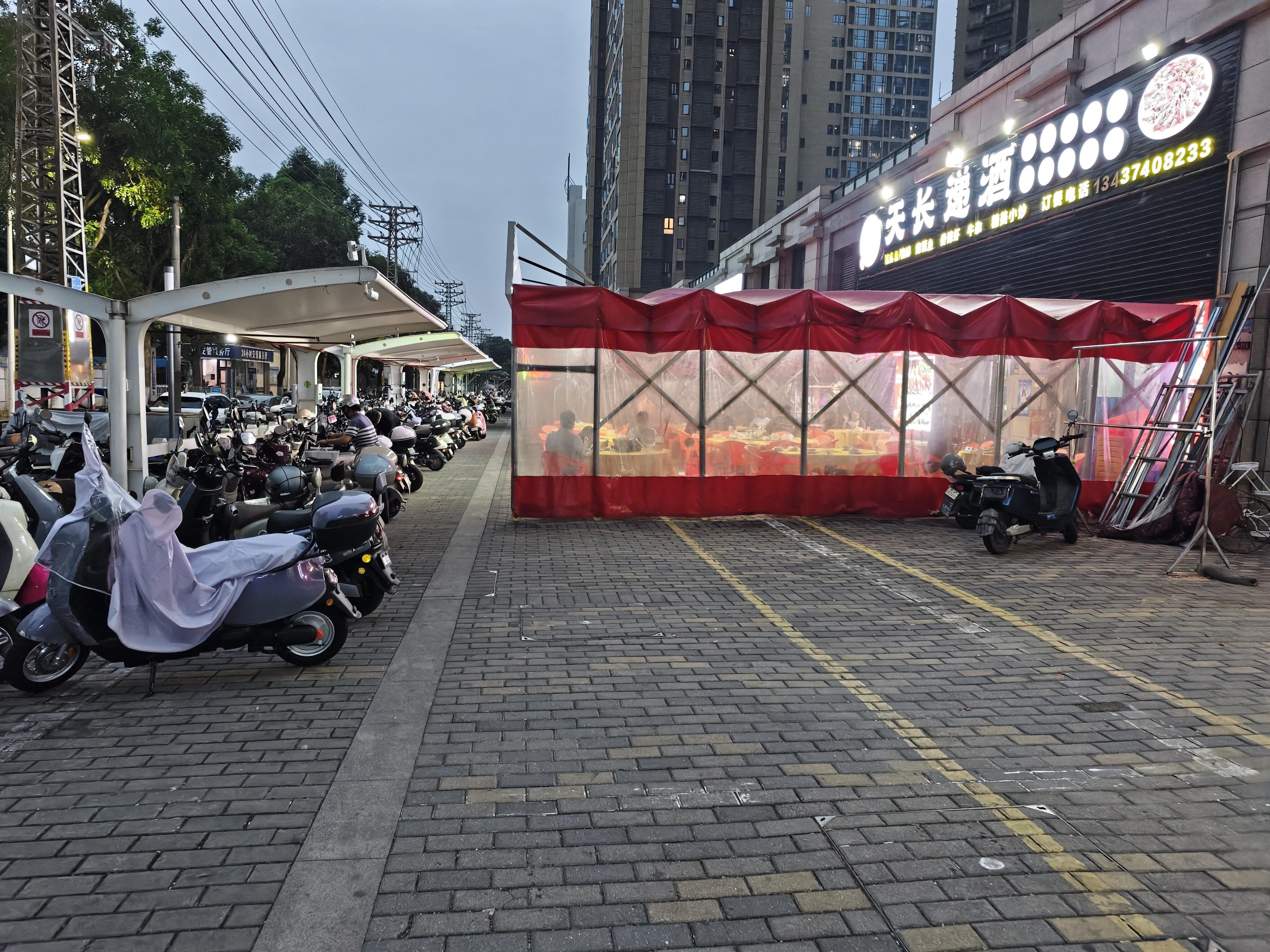 中央松湖东门左侧餐饮占道经营,下午营业拉开雨棚直接顶到电动自行车停放的棚子边上,到时摆放电动车位置减少人行过道完全占据,别家都未超出规划黄线就这家超出