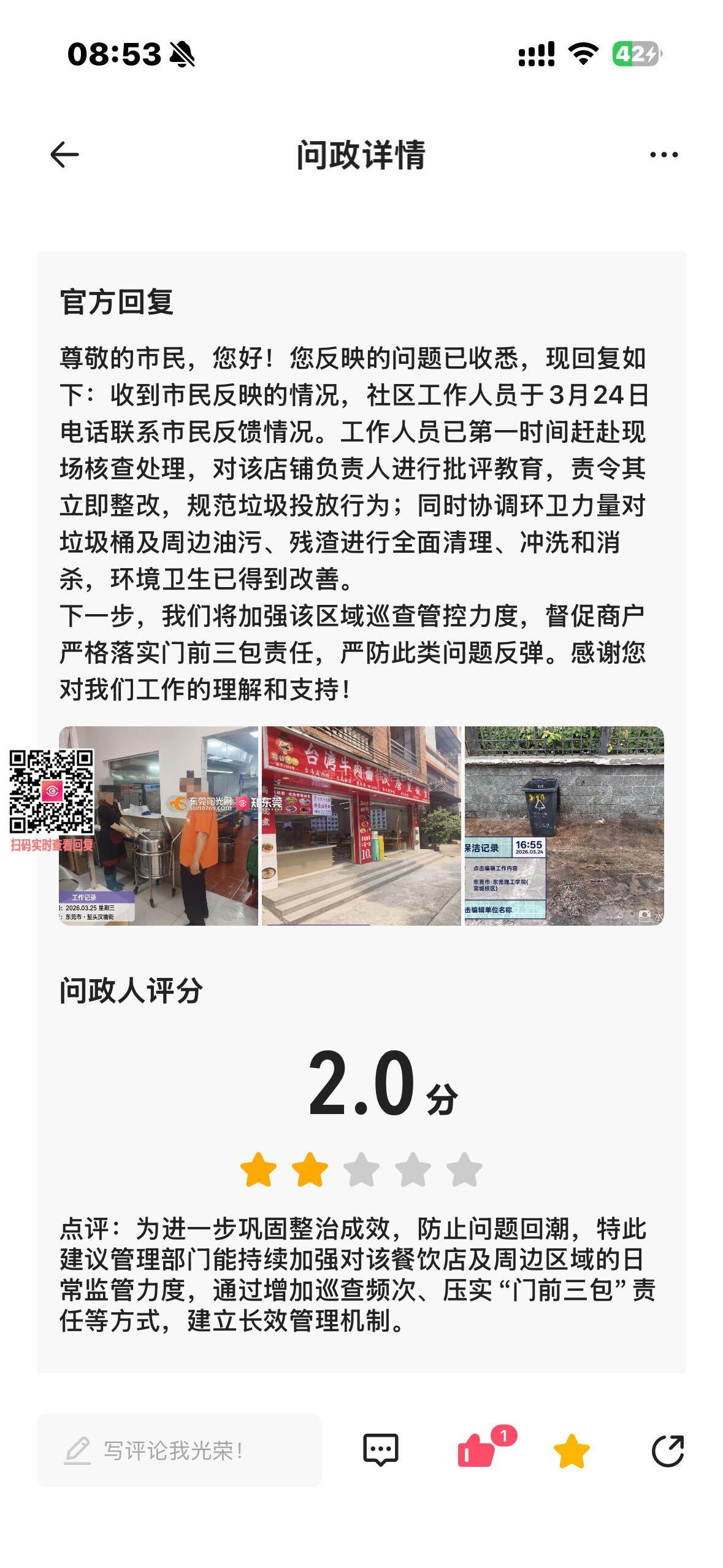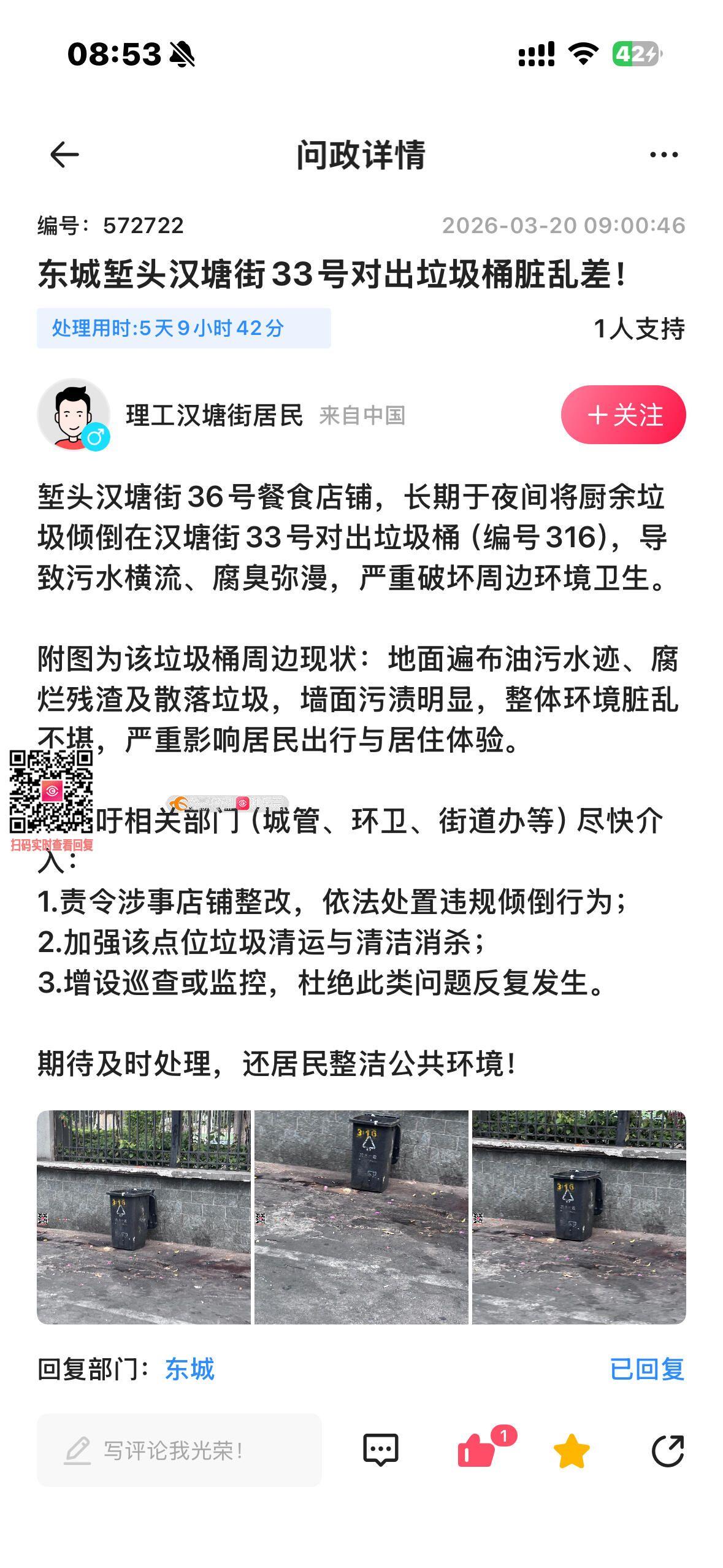 尊敬的部门领导: 就堑头汉塘街36号餐食店铺违规倾倒厨余垃圾问题,本人曾于3月19日投诉(编号572722),后获回复称已现场处理并责令整改。然而,该店并未真正纠正,仅调整了违法倾倒时间——从原晚11:30左右推迟至0:30前后,继续于深夜向居民区垃圾桶丢弃厨余垃圾,导致环境卫生问题持续存在。 此举表明店铺对整改要求阳奉阴违,问题实则未根本解决。我们不禁质疑:城管执法人员是否已掌握该店真实的夜间经营与倾倒规律?连续违规是否暴露了监管环节的疏漏?是否存在巡查不到位、甚至个别人员履职不力的情况?我们恳请上级部门深入核查执法过程,杜绝任何形式的保护或渎职行为,切实回应市民关切。 为维护公共环境与居民权益,现再次郑重投诉,要求对该店依法严肃查处,并建立有效监督机制,防止其利用监管时间差继续违规。请以实际行动取信于民,谢谢!