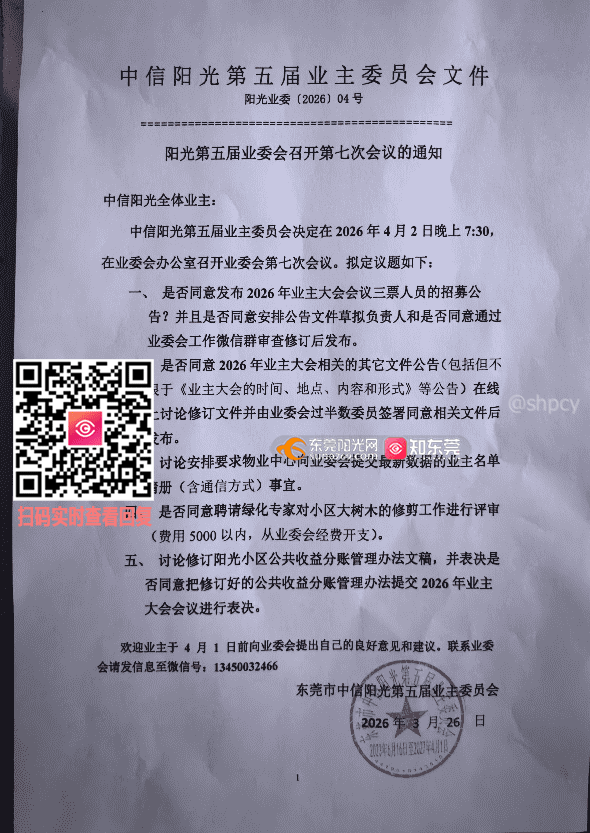 我是阳光小区业主。业委会的会议通知给出了4月2日的会议议程(附图1、图2),其中包括表决《分账管理办法(草案》是否上业主大会的议题,但是业委会并未同步张贴该草案。根据阳光小区议事规则的规定,业委会会议通知应该提前七天,公告会议议程和相关内容(附图3)。