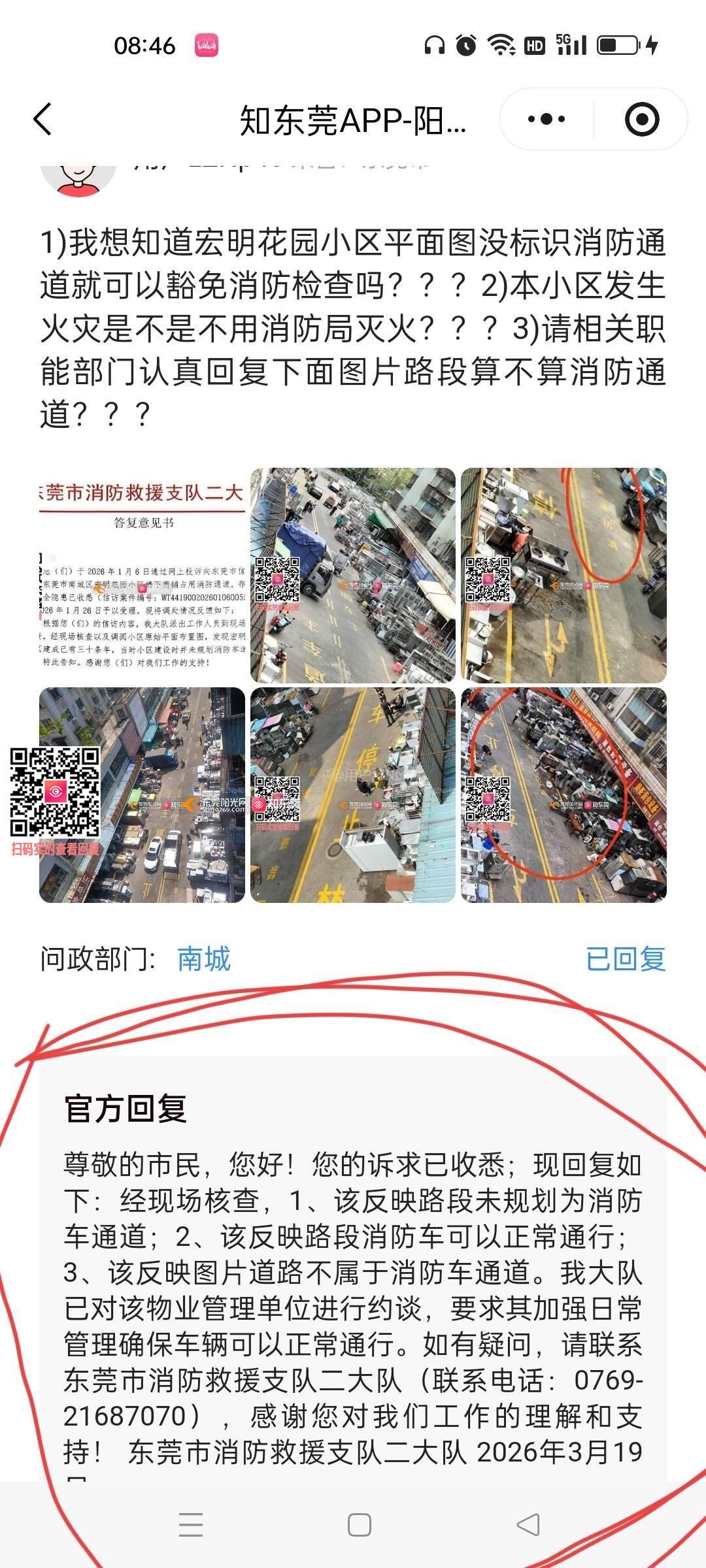 南城宏明花园业主多次投诉小区一楼消防通道长期被商铺占用,给居民带来非常大安全隐患,消防局回复是小区平面图不设消防通道,那么请问所有的消防通道是否必须经过消防局亲自划分才算数???小区自行规划的消防区城不算数???见图片