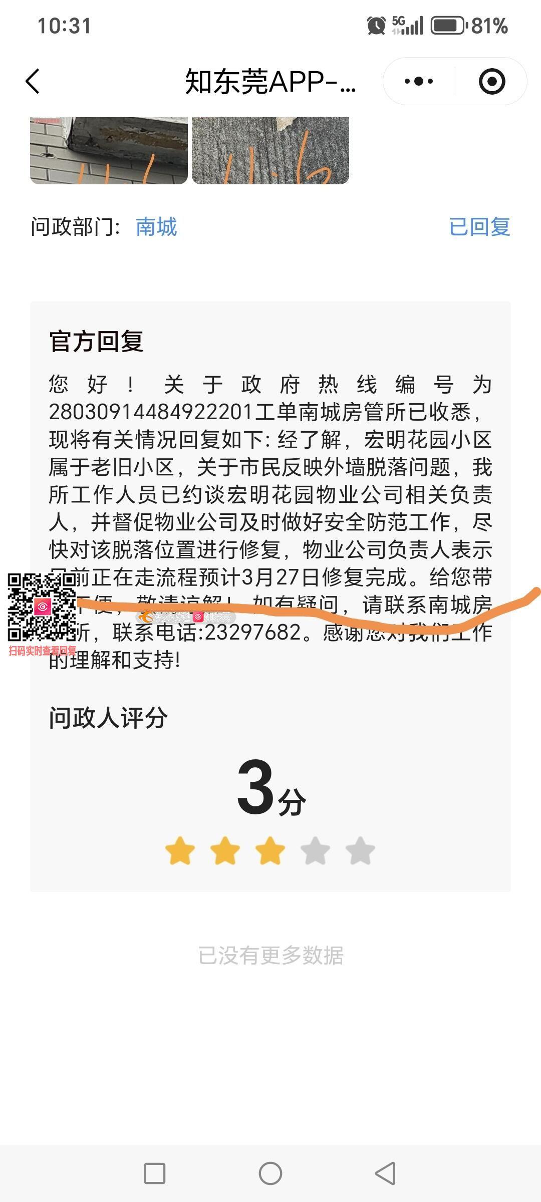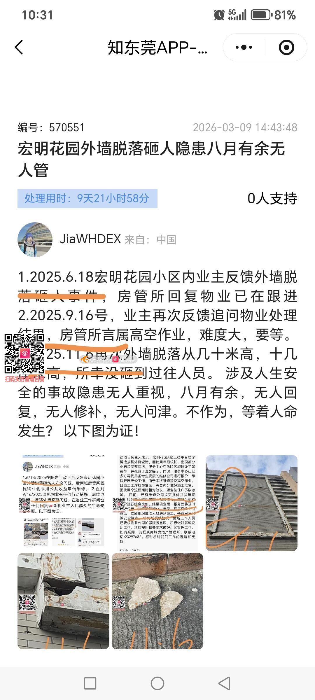 1.2025.6.18宏明花园小区内业主反馈外墙脱落砸人事件,房管所回复物业已在跟进 2.2025.9.16号,业主再次反馈追问物业处理结果,房管所言属高空作业,难度大,要等。 3.2025.11.6再次外墙脱落从几十米高,掉落十几厘米砖块,所幸没砸到过往人员。 4.2026.3.13第三次反馈.房管所回复督促物业2026.3.27修复。5.今天2026.4.2,隐患还是没排除,没修复,无人问津。 老旧小区住户的生命安全希望得到政府部门重视! 九月有余的安全隐患是物业乱作为?房管所不作为? 以下图水印图片为证