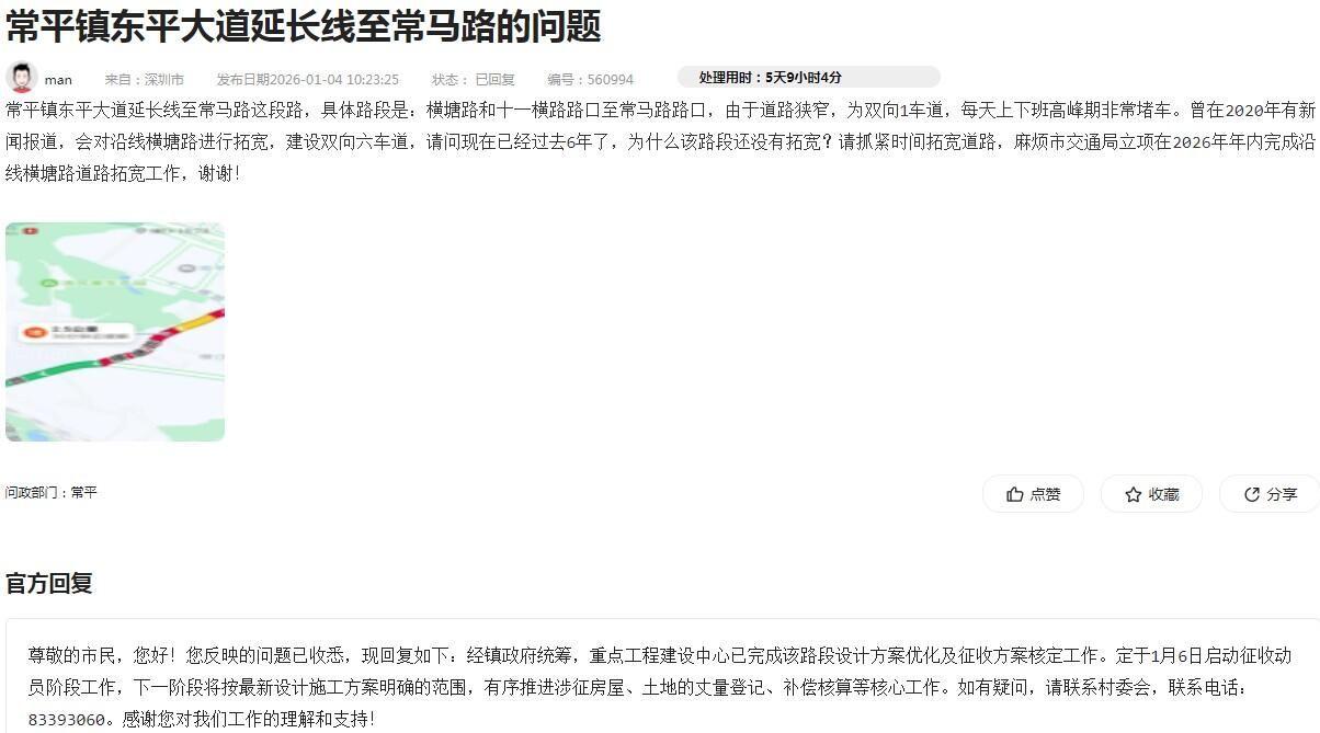 我在2026年1月4日反映:东平大道延长线(横塘路至常马路口)仅为双向1车道,早晚高峰严重堵车,询问何时完成拓宽。 常平镇2026年1月6日回复:已完成设计方案优化及征收方案核定,定于1月6日启动征收动员,后续推进涉征房屋、土地的丈量登记、补偿核算。(如图) 现在已经2026年4月2日,这条路仍然没有任何拓宽迹象,天天上下班高峰堵死。 请问: 1、征收动员启动近三个月,丈量登记和补偿核算完成了没有? 2、具体什么时候正式动工? 请给一个明确时间,不要再让市民天天堵在路上。谢谢!