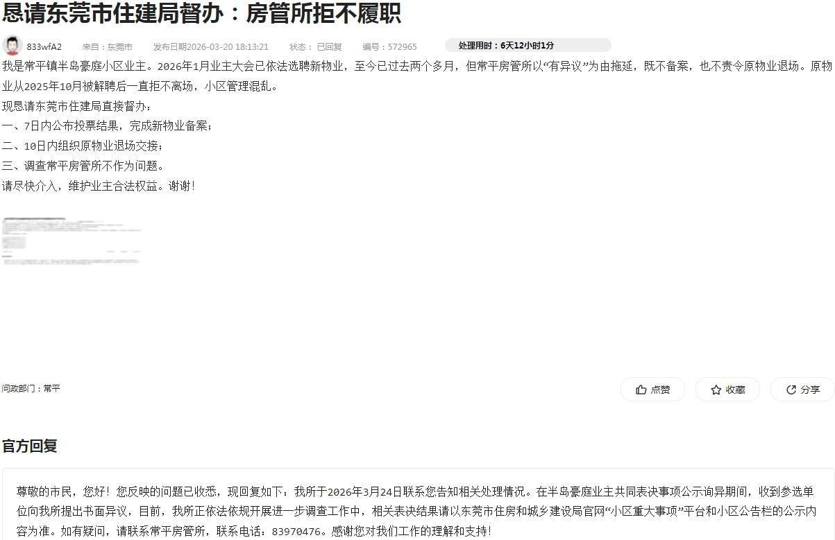 我于3月反映:小区业主大会已于1月依法选聘新物业,但常平房管所所以“有异议”为由拖延备案,旧物业自2025年10月被解聘后一直拒不离场。当时房管所回复称:收到参选单位书面异议,正依法依规调查,表决结果以官网和公告栏为准。(如图) 现在又过去多日,房管所仍未公布投票结果,也未完成新物业备案。至今旧物业彻底摆烂:卫生不搞,小区到处是垃圾,电梯里也有垃圾。更严重的是,3、4栋负二层地板持续渗水,开发商和物业都不管,业主担心水土流失导致楼塌陷,生命安全毫无保障。 现再次恳请东莞市住建局直接督办: 1、立即公布投票结果,完成新物业备案,让新物业尽快进场; 2、责令常平房管所组织旧物业退场交接,不能再拖; 3、责成相关单位处理负二层渗水问题,排查楼体安全风险。 请不要再让几百户业主生活在垃圾堆和安全隐患中,谢谢!