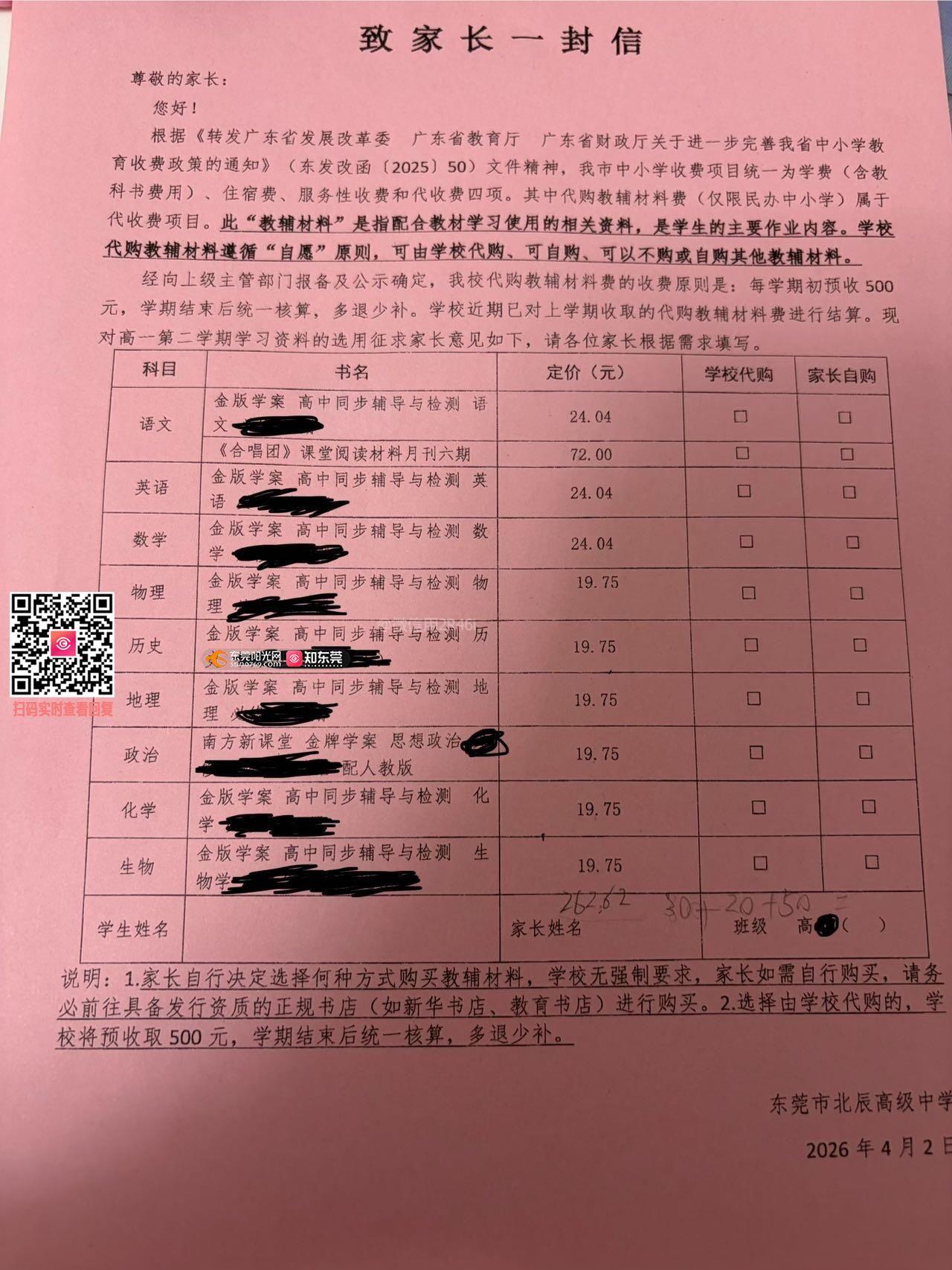 东莞北辰高级中学教辅资料收费未标明 乱收费