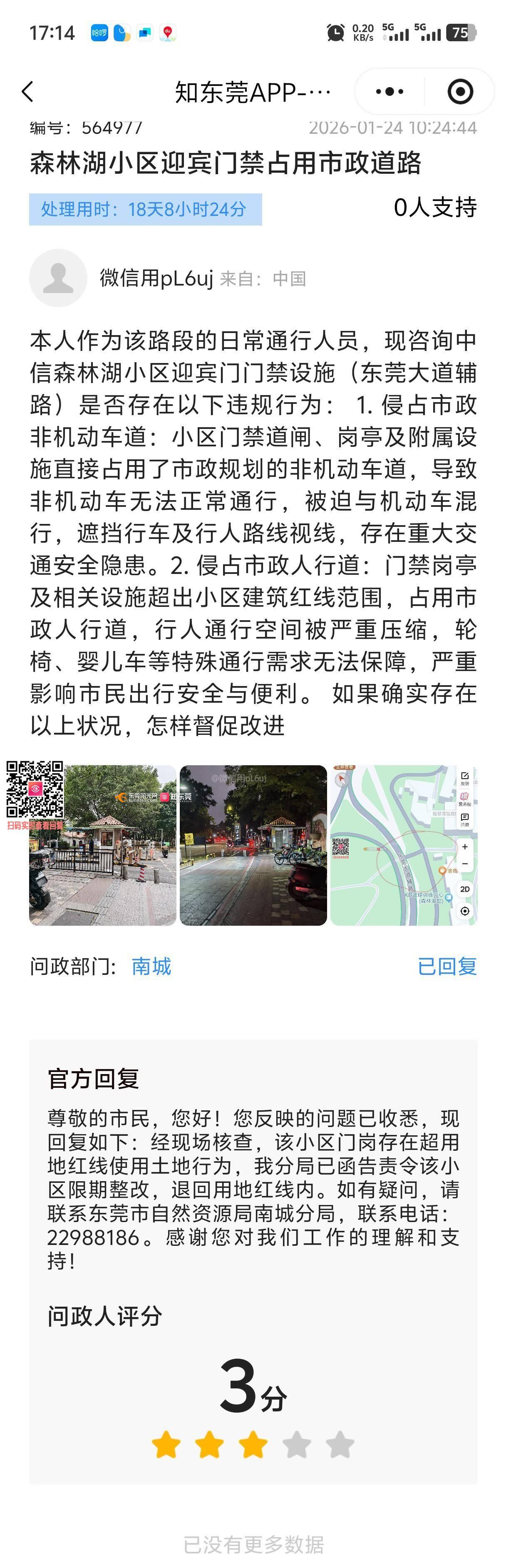 2026年1月份,在阳光问政问过森林湖小区迎宾门门禁占用人行道路的问题,当时相关工作人员已经回复给我,小区门禁确实占用市政道路,小区管理方已经答应整改,由于过年期间,时间不便,现已四月,目前这个情况还没有整改,和原来一样。