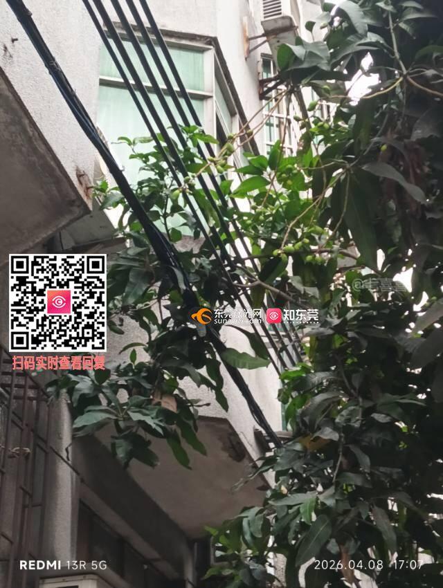 野生大树压着电线,生向居民住宅,滋生蚊虫