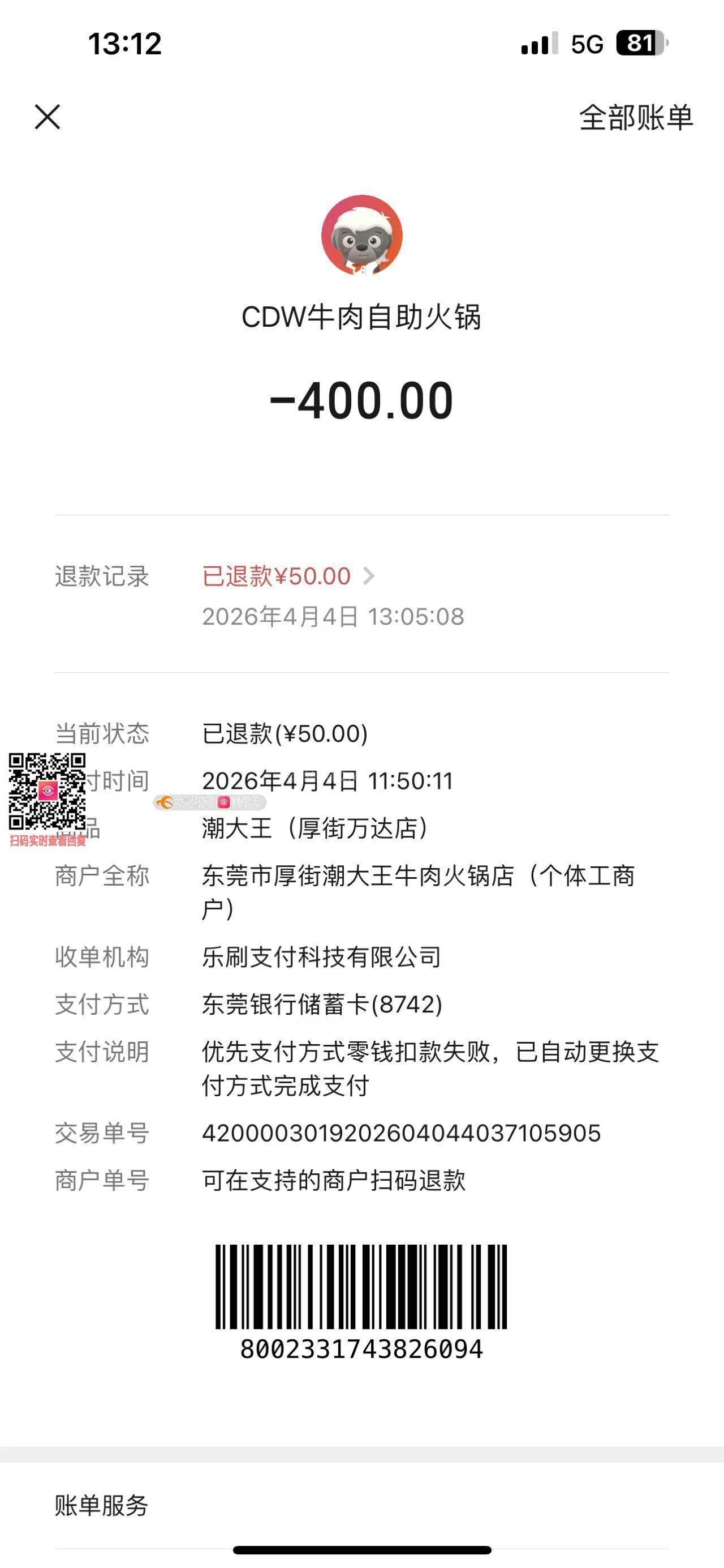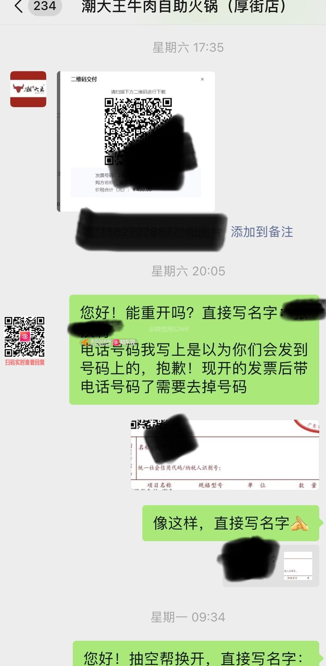 本人携家人于2026.04.04日11:50分,在潮大王万达厚街店消费400元,申请开票时按店长要求加微信提供付款截图及开票信息联系方式,商家于2026.04.04日17:35发发票二维码,本人扫码识别发票信息有误,个人发票名字后有电话号码,故提出发票不符申请重开,先后4次发信息申请重开,但店家一直不回复,希望协调店家重开发票