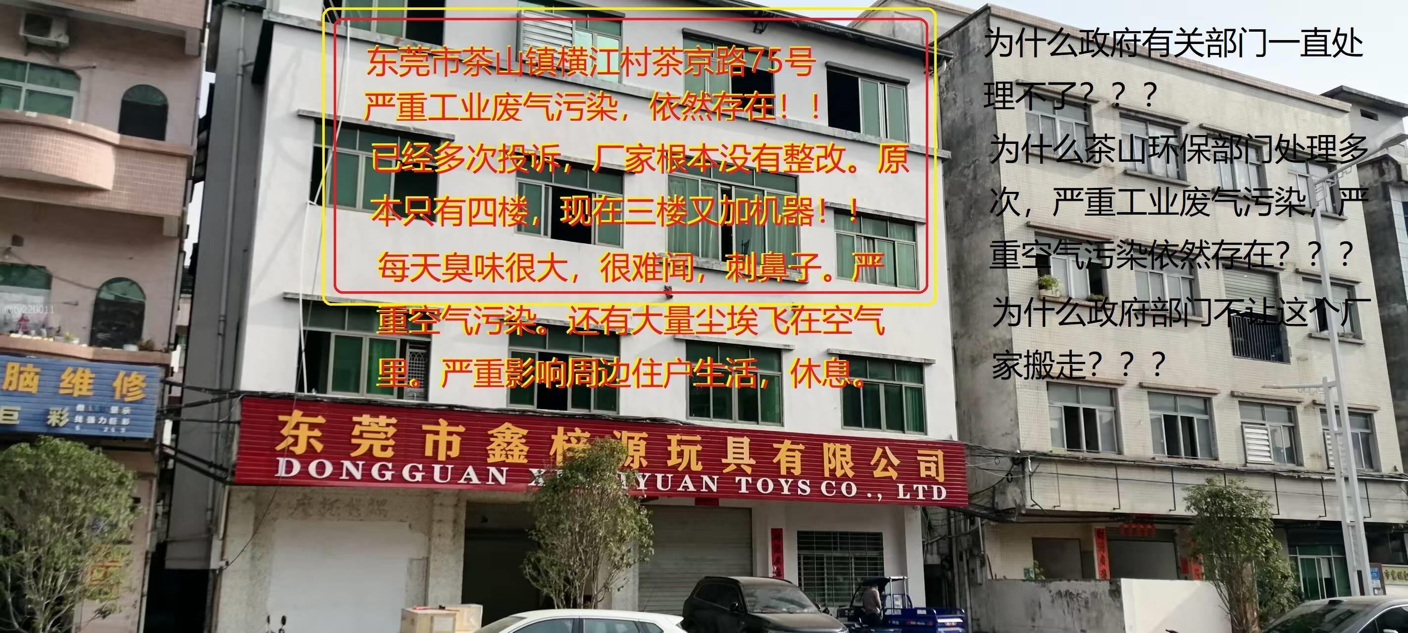 位于东莞市茶山镇横江村,茶京路75号,现在招牌是:东莞市鑫梓源玩具有限公司。位于四楼,在楼顶后面,有一个烟管,一直在向处排烟气,臭味很大,很难闻,刺鼻子。严重空气污染。还有大量尘埃飞在空气里。