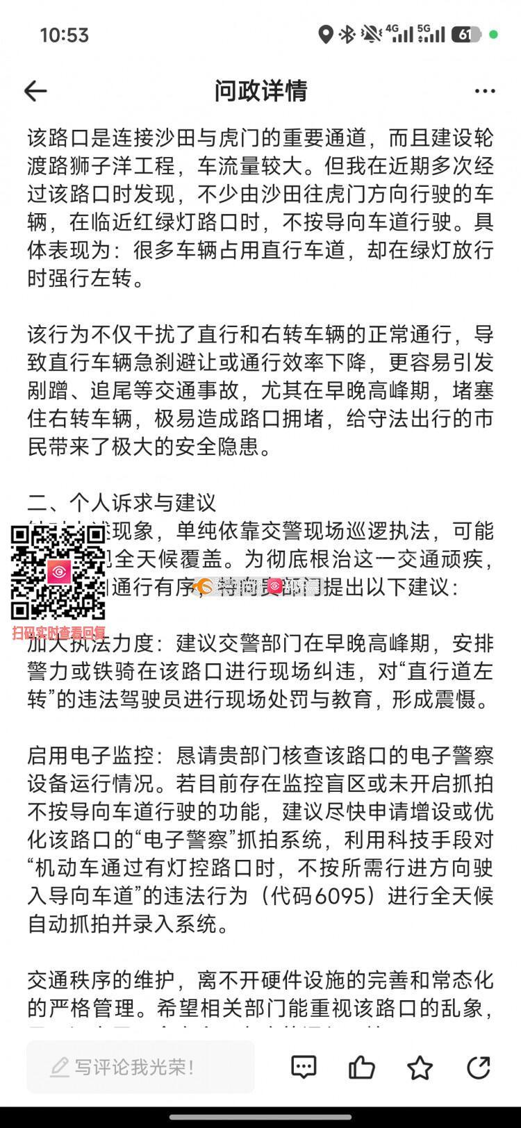 上个月问政后,虎门东引街红绿灯路口(沙田往虎门方向),不按车道行驶的情况没有改善,如果每次违章都需要付出150元的代价,一定不会有那么多车仍在直行车道左转。