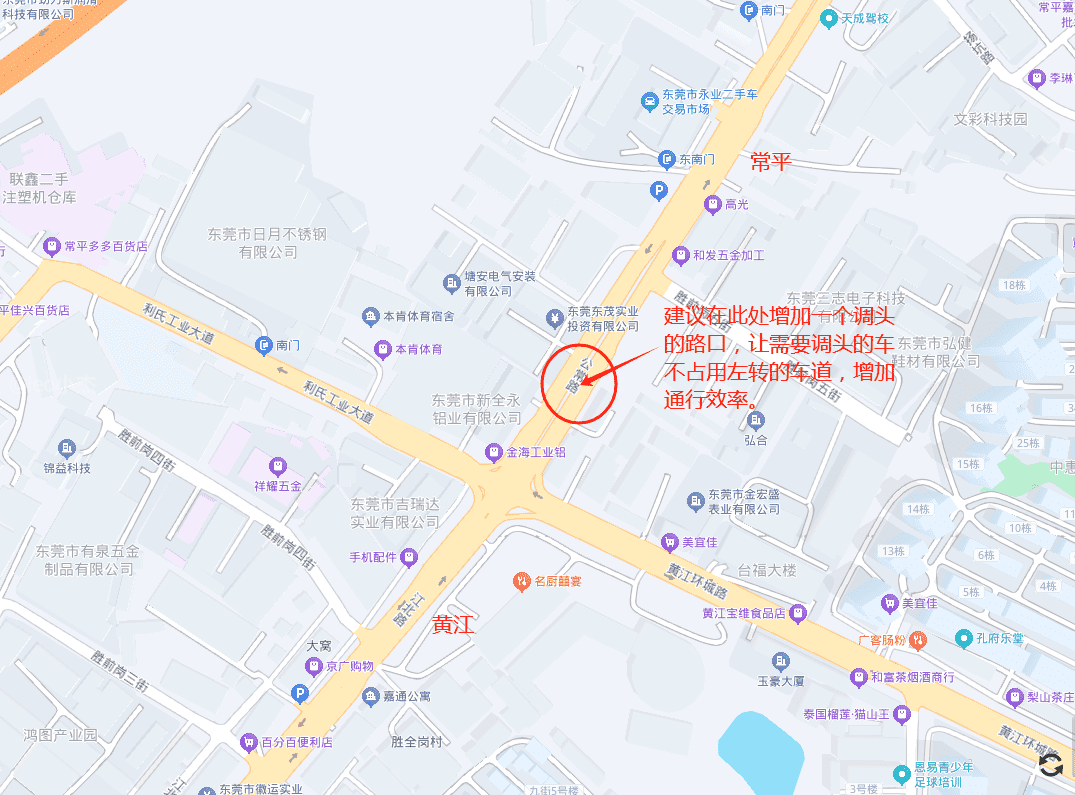 黄江镇常黄路与黄江环城路交界红绿灯路口通行的车很多,红绿灯的时间较长,建议增加调头的路口,让需要调头的车不占用左转的车道,增加通行效率。 常黄路正在改建的常平段基本在每个红绿灯路口都增加了调头路口!
